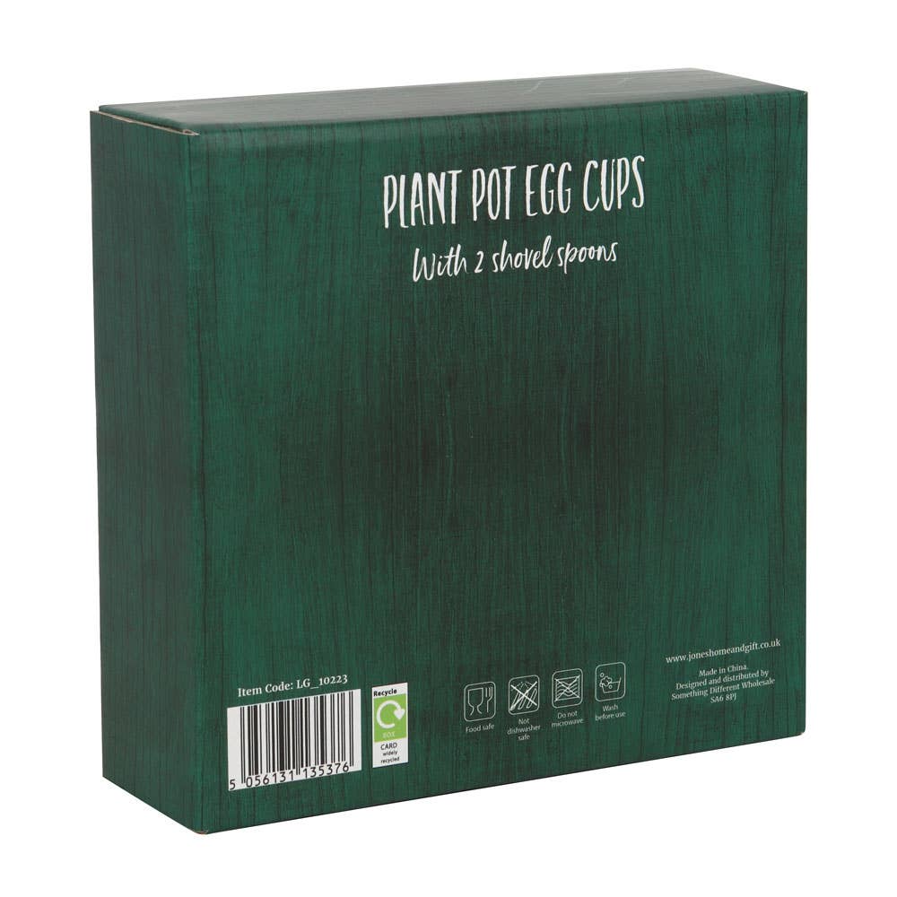 Add a touch of whimsy and nature to your breakfasts with this adorable set of two egg cups in the shape of mini flower pots , accompanied by matching spoons-shovels .