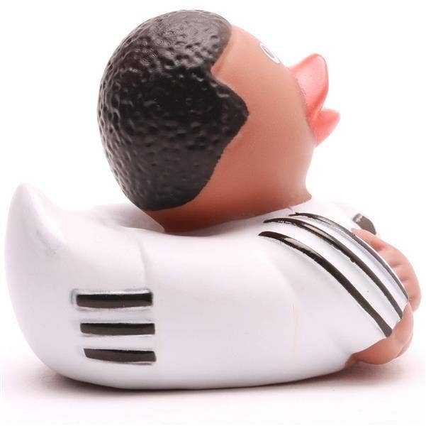 Ce canard de bain footballeur apporte l'ambiance du stade directement dans la baignoire. Avec son maillot blanc, ses rayures noires distinctives et le ballon de football fermement pressé contre sa poitrine, il semble prêt à tirer le penalty décisif. Son regard concentré révèle que ce canard en plastique est prêt pour chaque match – que ce soit dans le bain, la piscine ou la vitrine du collectionneur. Le design détaillé fait de cette figurine un véritable accroche-regard. Les cheveux bouclés et texturés, les bras puissants et le look typique de sportif confèrent au canard de bain un caractère sympathique. En même temps, il reste bien sûr ce que nous aimons tous : un classique canard en plastique qui, avec son joyeux couinement, met de bonne humeur. La combinaison de couleurs claire de blanc, noir et tons de peau donne un aspect sportif et moderne, parfait pour les fans de football de tout âge. En tant que cadeau, ce canard de bain est idéal pour tous ceux qui vivent et aiment le football – du fan de club au