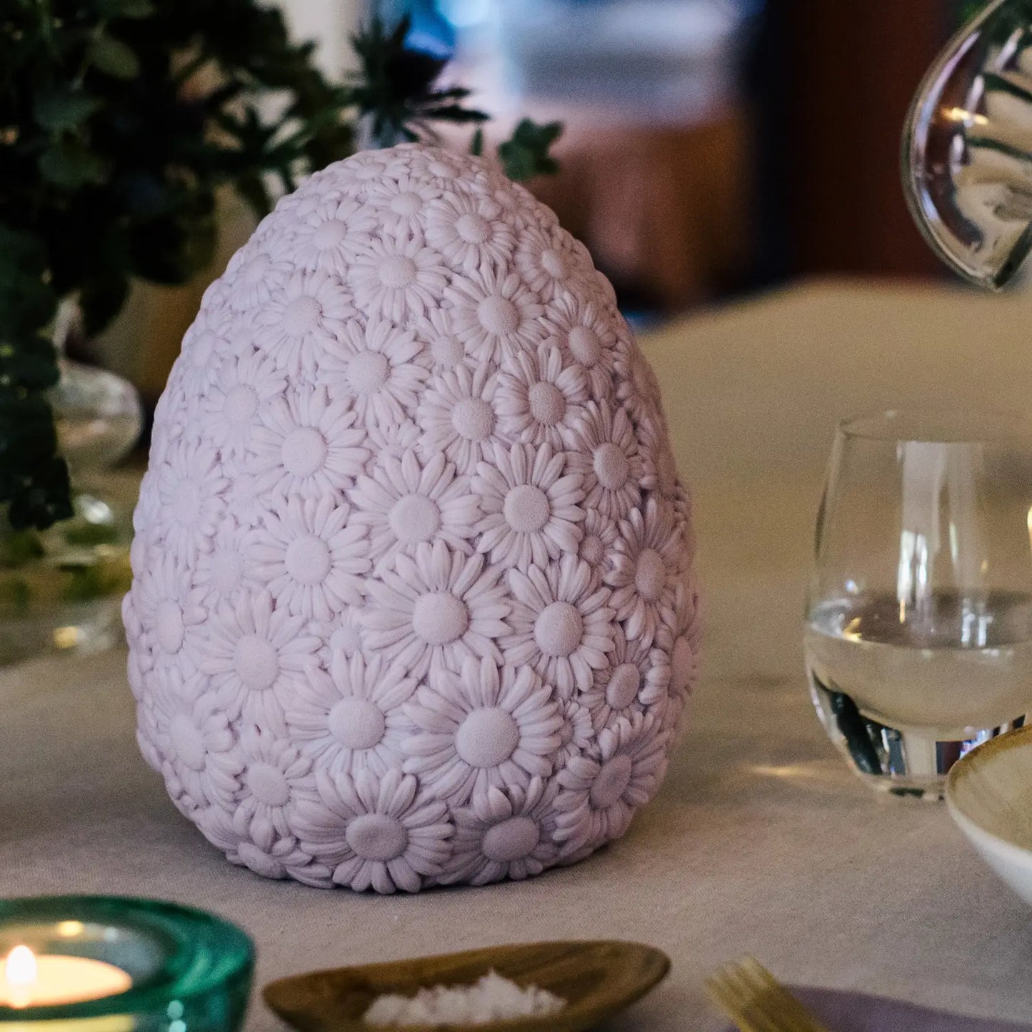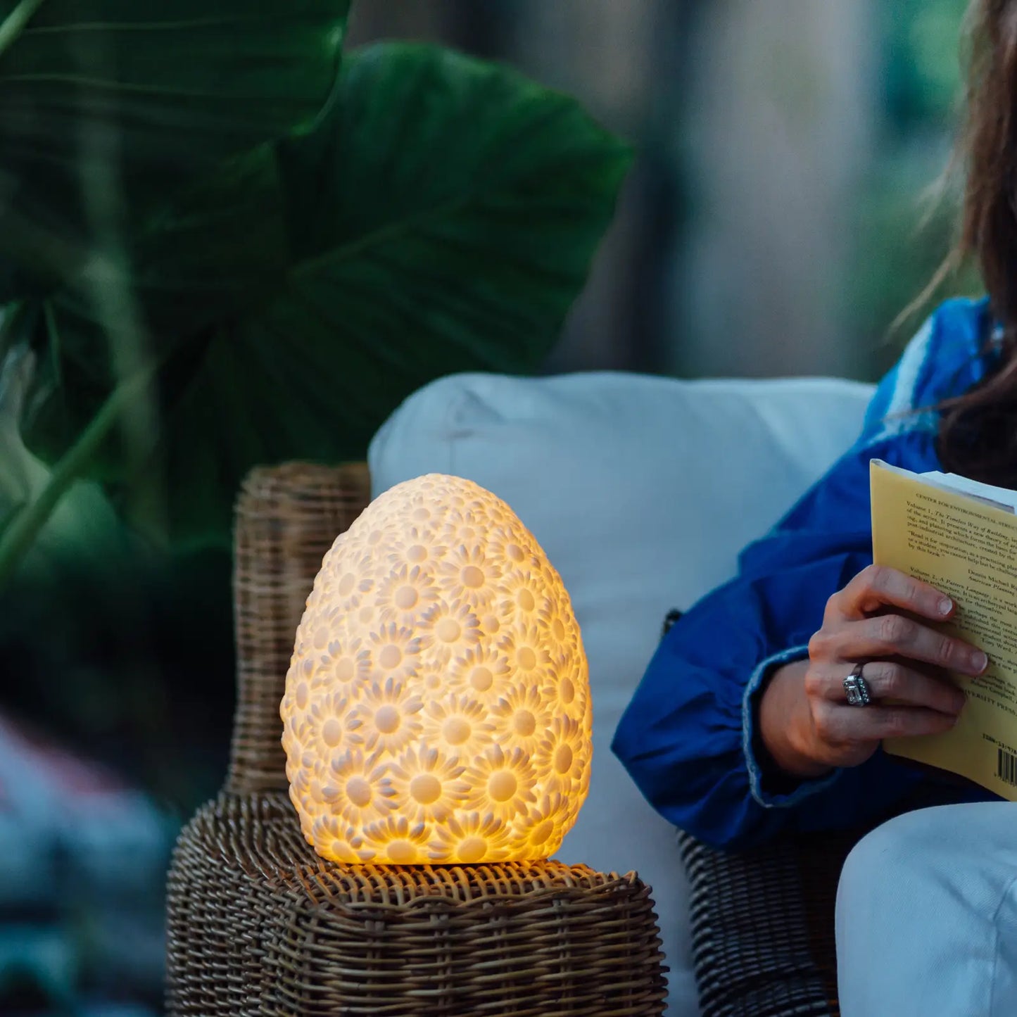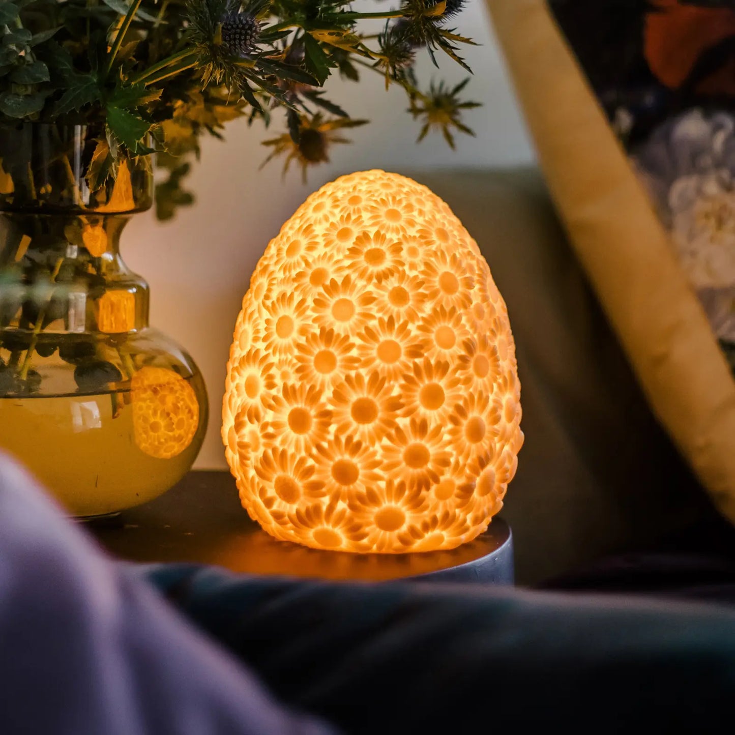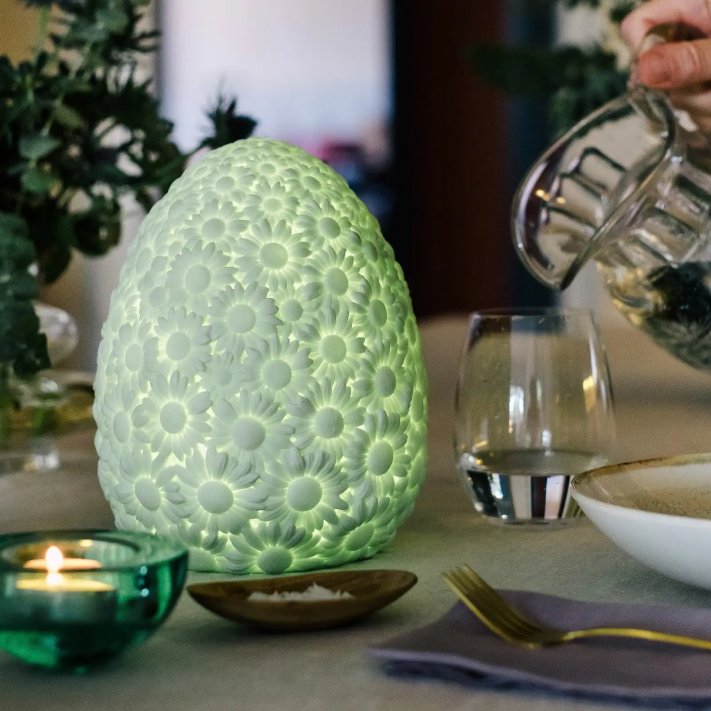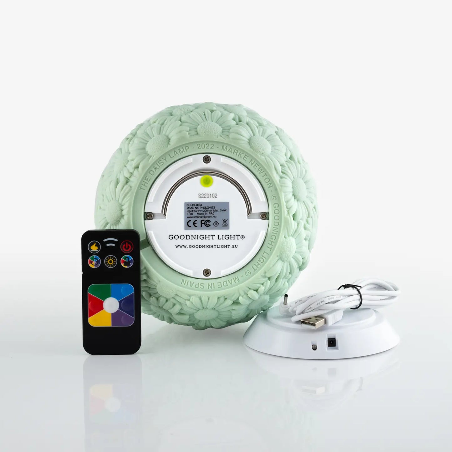 THE DAISY LAMP, an Ode to Joy! THE DAISY LAMP shakes up the Codes! A refined Universe, which spreads Joy, Good Mood, Good Vibes, Freshness, Beauty, and Love! Hand-sculpted, MARKE NEWTON wanted to recreate the beauty of the pretty Daisy flowers, an intergenerational emblematic flower, reminding us all, of a Moment, a Memory, an Ode to Life and Love! Entirely eco-responsible and made in Spain, the technique used by Designer Marke Newton is Tesselation. - Perfect portable table lamp with handle - Induction charging dock + Remote control - 4 Colors.
