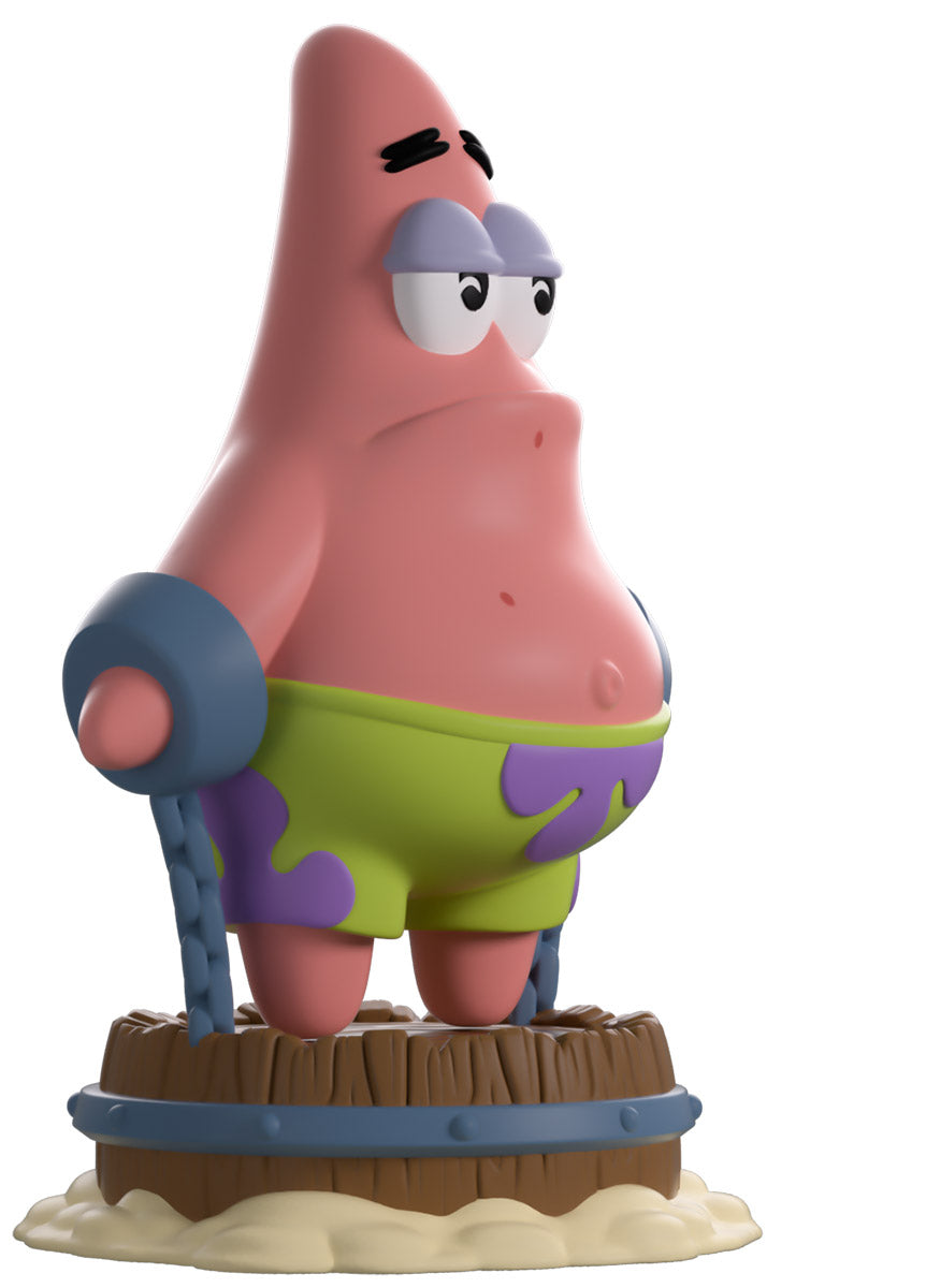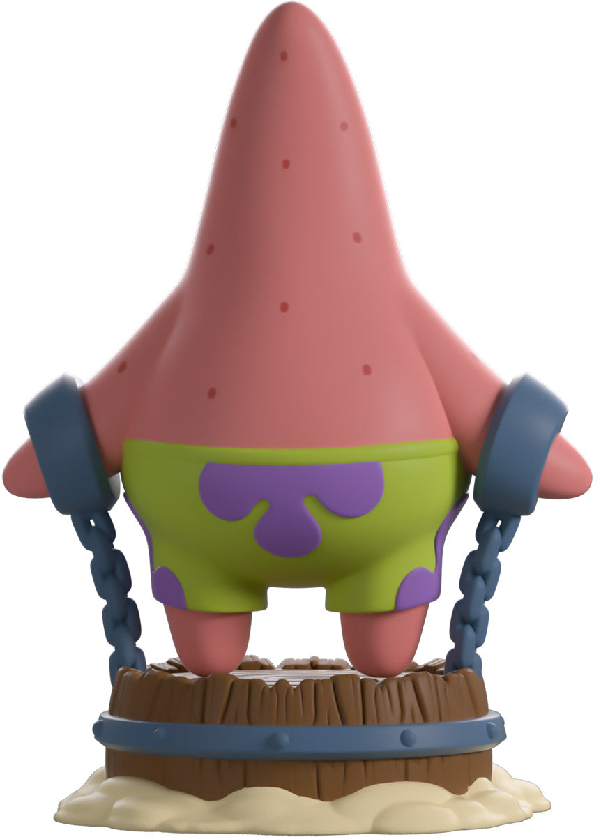 Patrick has been captured; he is chained up and waiting for more! Standing 5 inches tall, Patrick is standing on a wooden barrel with his arms outstretched to the side as they are chained to the base of the barrel. He has a solemn frown on his face. The glass-fronted display box features Patrick chained up in the middle of an arena as dozens of fish sit in the stands watching. The inside of the box has been designed with a blue background with many different SpongeBob designs all over the inside of the box. The protective sleeve is designed with a yellow mosaic pattern. This collectible comes in a protective matte, embossed outer sleeve and a custom-sized plastic protector for maximum protection during shipping.