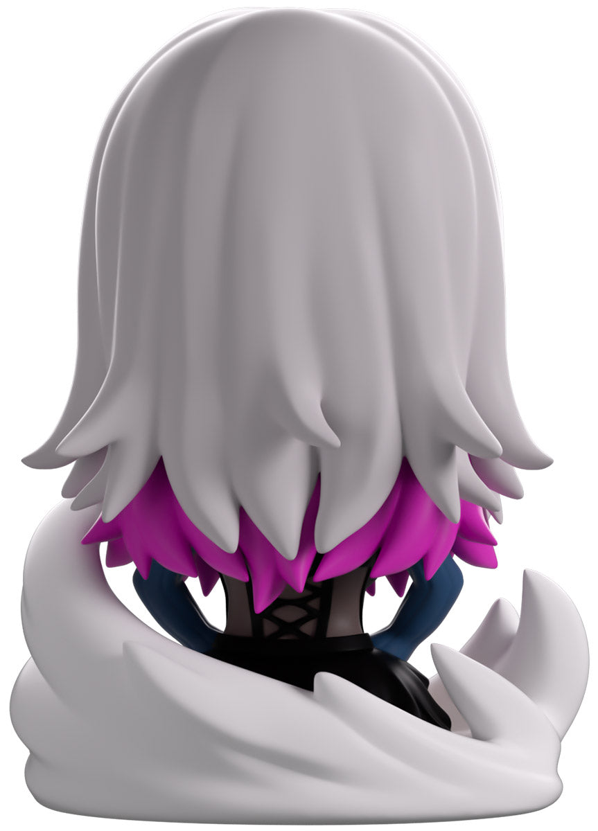 In her quest to find her friend Mikaela, Sable has found herself in the basement of Youtooz with plenty of time to pose for a collectible figure! Measuring 3.5 inches tall and designed to show Sable in a kneeling position with her hands resting on her thighs as light gray smoke swirls around her, she is dressed in a black dress with corset stays down the front. With arms sheathed in a ribbed blue bolero top and a gray necklace around her neck with a heart charm in the middle, her gray and pink hair falls over her shoulders and frames her face while highlighting the heart tattoo on her cheek. The glass display box was designed to showcase the ticket booth of an old movie theater at night. While the interior is a black silhouetted forest with a glowing red and blue mist and the white "Dead by Daylight" logo on the back, this sinister design then continues onto the protective sleeve with dark trees completely surrounding it as their silhouette can be seen through the large clear window on the front. This collectible comes in a protective matte, embossed outer sleeve and a custom-sized plastic protector for maximum protection during shipping.