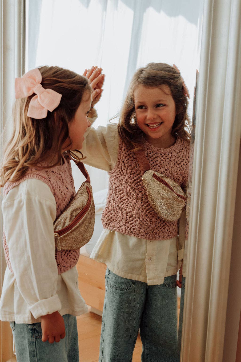 Very trendy, this fanny pack brings a touch of glam with its gold glitter fabric, perfect for adding a twist to plain outfits and storing your little treasures!