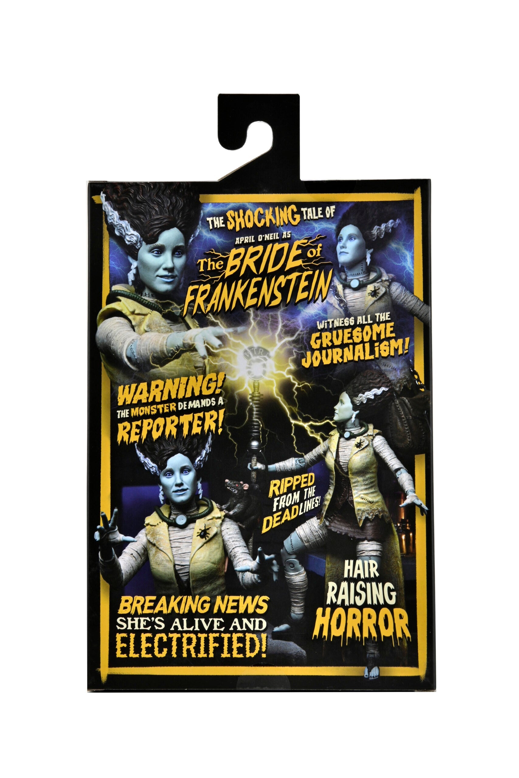 ¡April as The Bride reimagina a April O'Neil (Judith Hoag) como la novia de Frankenstein en una aterradora combinación! ¡Revelaciones electrizantes! ¡Informes impactantes! Éste es un periodismo que realmente va directo a la yugular. El único reportero reanimado de WTRL desentierra suciedad con una variedad completa de accesorios y nunca se pierde una fecha límite... Esta figura a escala de 7" presenta un micrófono, un bolso, una araña, un sai relámpago, cabezas intercambiables y manos intercambiables.