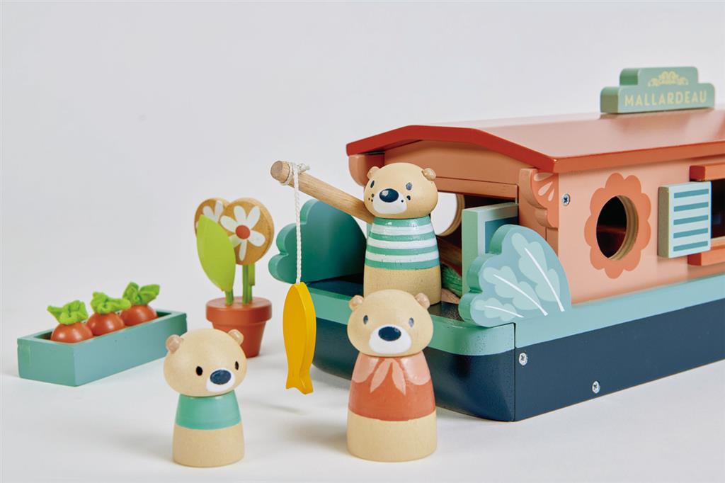 Conozca a nuestra nueva familia de nutrias que vive en el río en un hermoso barco fluvial llamado "Mallardeau", llamado así por su pato real favorito, que se sienta orgulloso en la parte delantera. Observa la pequeña caña de pescar en la parte trasera y la paja rayada que también hace las veces de chimenea. El techo es desmontable y la cabina se puede elevar. El conjunto incluye: una estufa de leña, un cajón de cerillas, una mesa con tapa de tarro de mermelada con patas en forma de cerillas, 3 tapones para botellas, 3 sacos de dormir tejidos, una hilera de verduras, una decoración de pared de pato silvestre, una maceta, un cafetera y un tarro de mermelada.