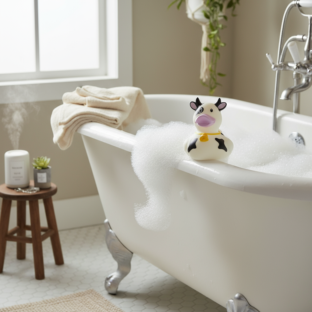 Por supuesto, usando una campana alrededor del cuello, en forma de pato de baño. En su bañera o en un estante, también se sentirá cómodo como en los prados verdes.
