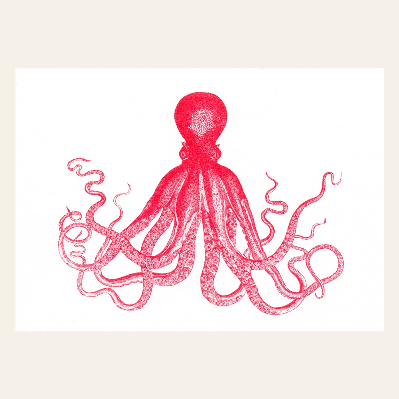 Esta postal de pulpo , impresa en vibrante risografía roja , celebra la fascinante belleza del mundo marino con un estilo a la vez retro y moderno.