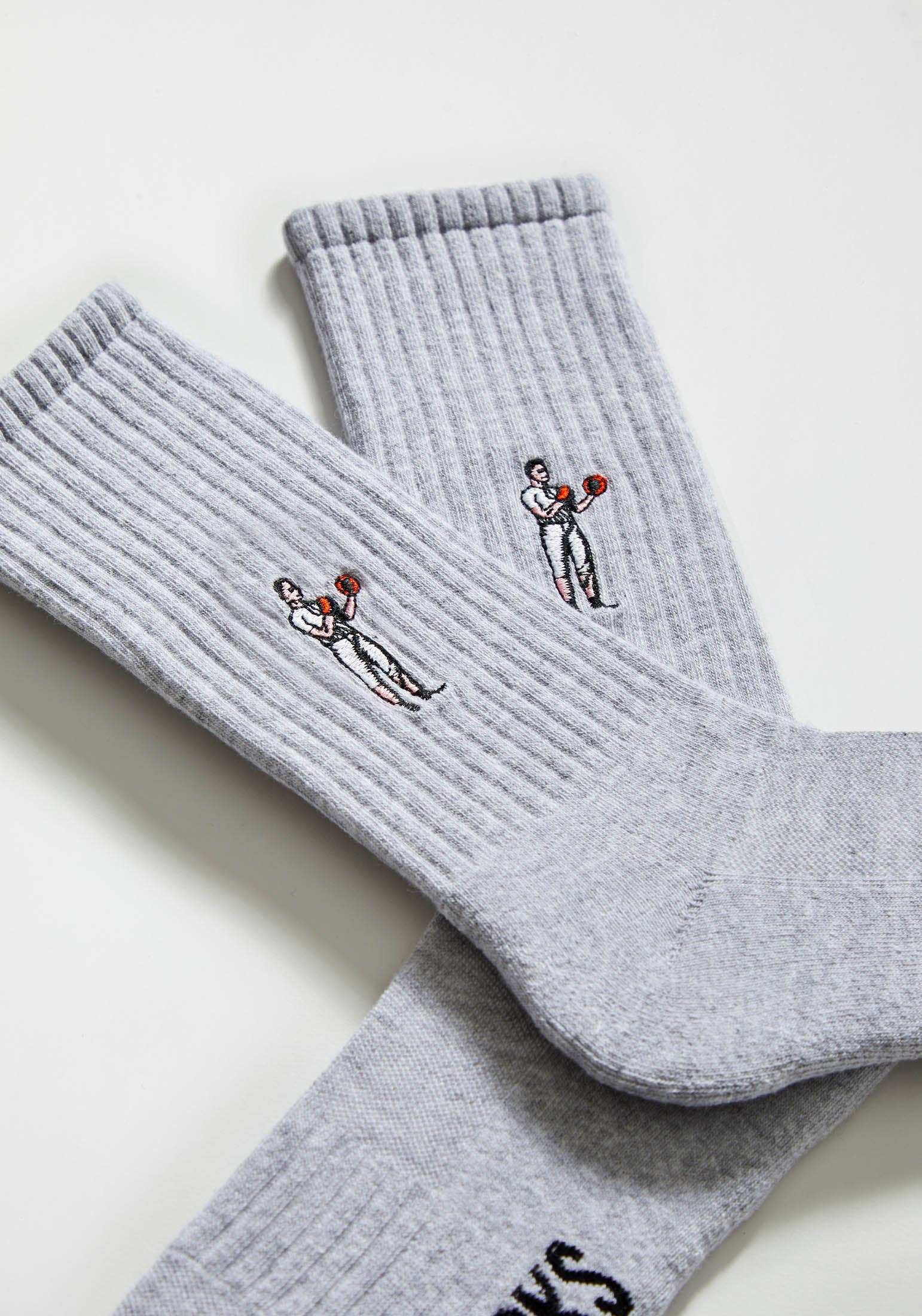 Calcetines grises con diseño bordado y estilo deportivo, confeccionados en algodón 100% orgánico. Media caña. Ideales para looks urbanos.