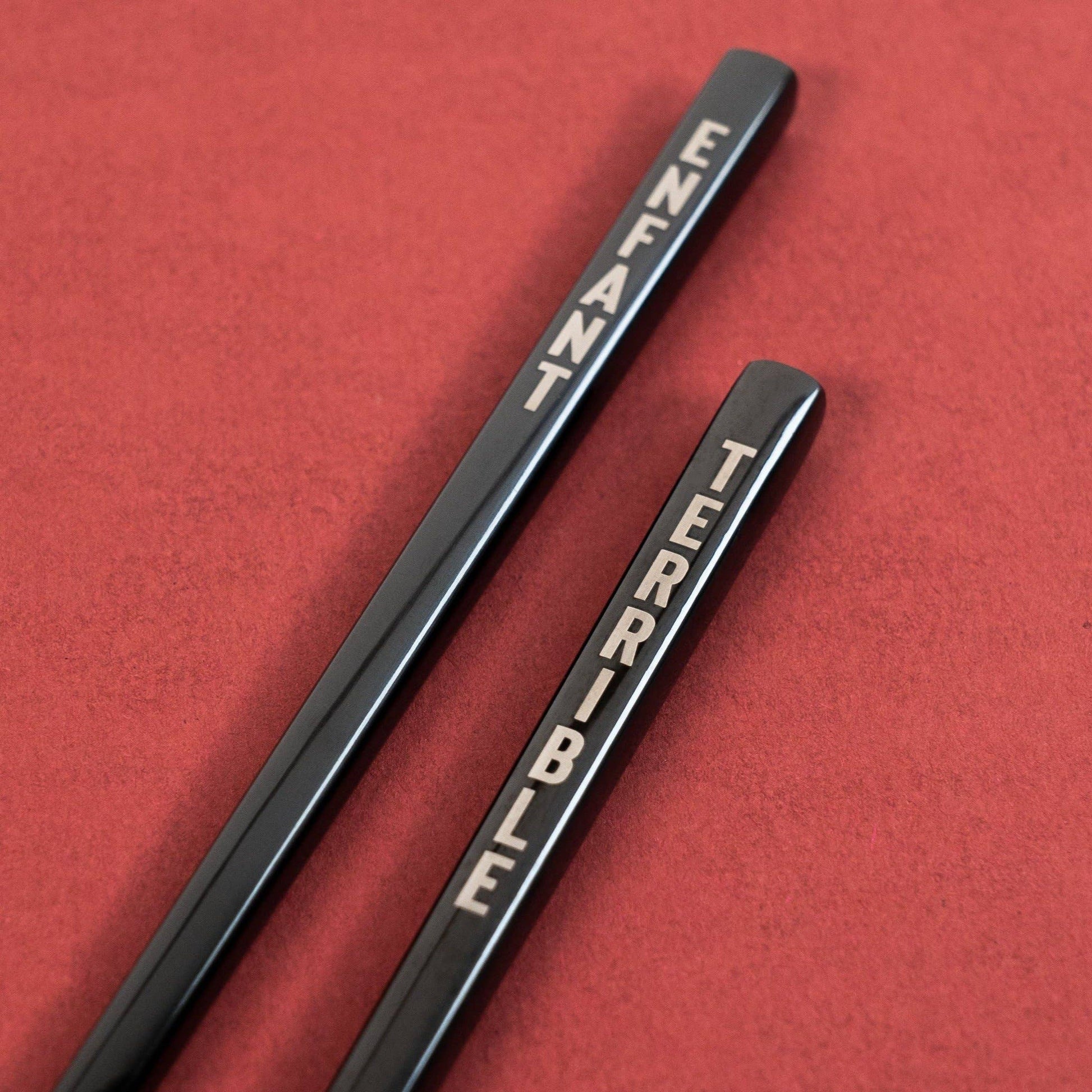 Palillos asiáticos fabricados en acero inoxidable. Grabado láser. Personalización "NIÑO TERRIBLE". Ideal para uso personal diario o como regalo. El accesorio imprescindible para los amantes de la cocina asiática. Fácil de limpiar, a mano o en lavavajillas. Fabricado en Francia. Descripción: Palillos asiáticos Grabado: Láser Color: Negro Tamaño: 23 cm Peso: 20g Material: 100% acero inoxidable
