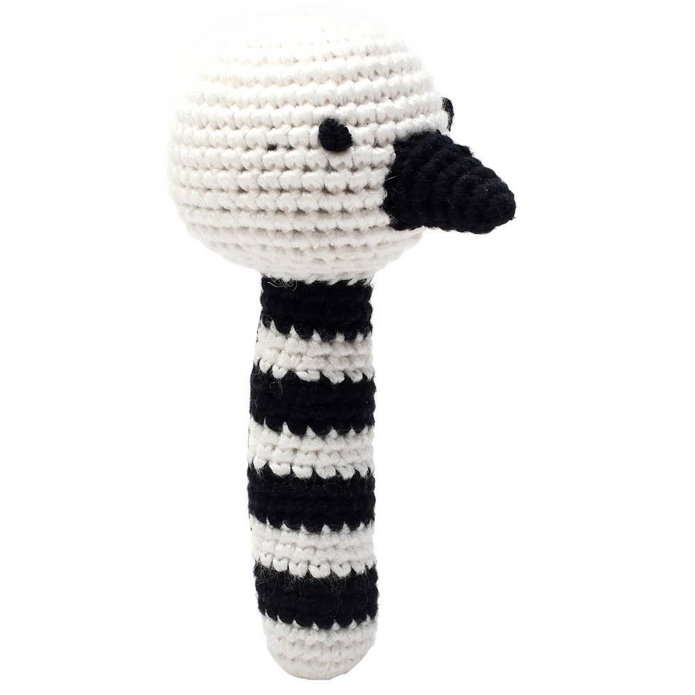 El sonajero mide aproximadamente 14 cm de largo y produce un sonido de traqueteo cuando lo agitas.