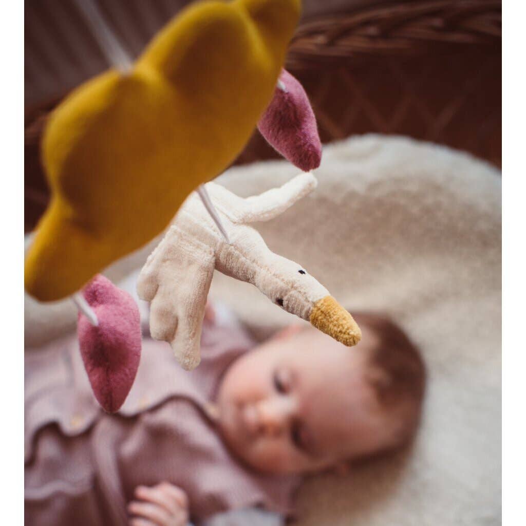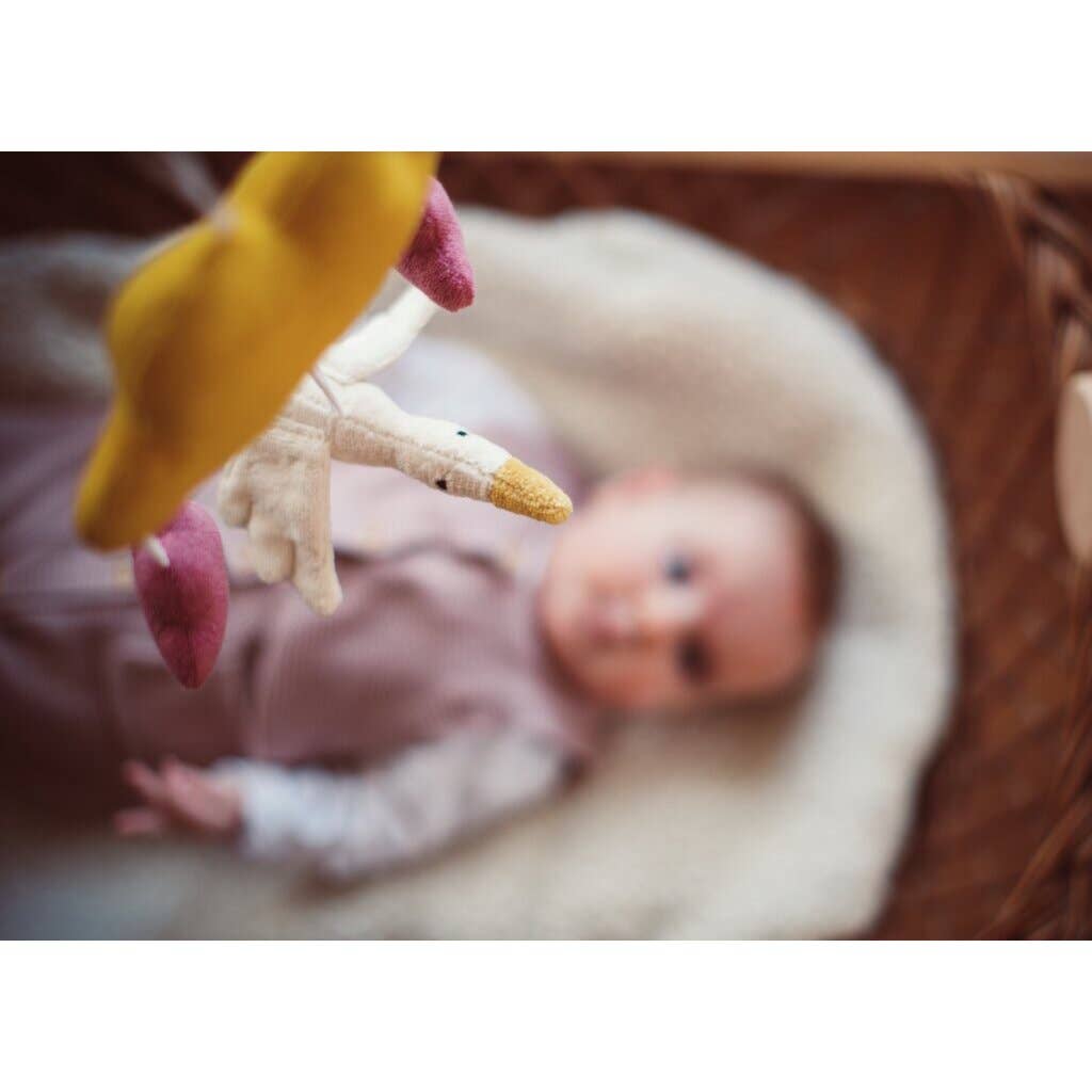 Este precioso móvil rosa llamará la atención en cualquier habitación infantil. Gracias a la práctica anilla de la nube amarilla, se puede colgar fácilmente en cualquier lugar: desde la cuna hasta el cochecito, para llevarlo siempre contigo. Las nubes y el ganso también se pueden separar individualmente y usar, por ejemplo, en la cadena del cochecito. El suave movimiento del móvil ayuda a los niños a calmarse y a dormirse más fácilmente.