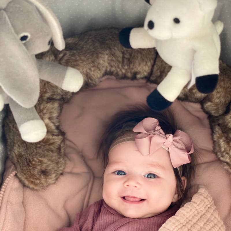 El remolque para cochecito está fabricado con algodón orgánico certificado, tanto la tela exterior como el acolchado. En el interior del animal, hay un sonajero con un suave crujido.