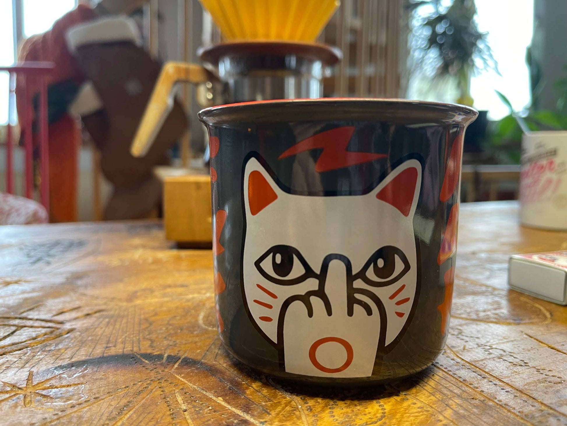 ¡Aquí está la taza más atrevida de la mañana 😼☕! Inspirada en el famoso gato de la suerte japonés Maneki Neko , esta versión rebelde te saluda a su manera… con un dedo levantado y mucha actitud.