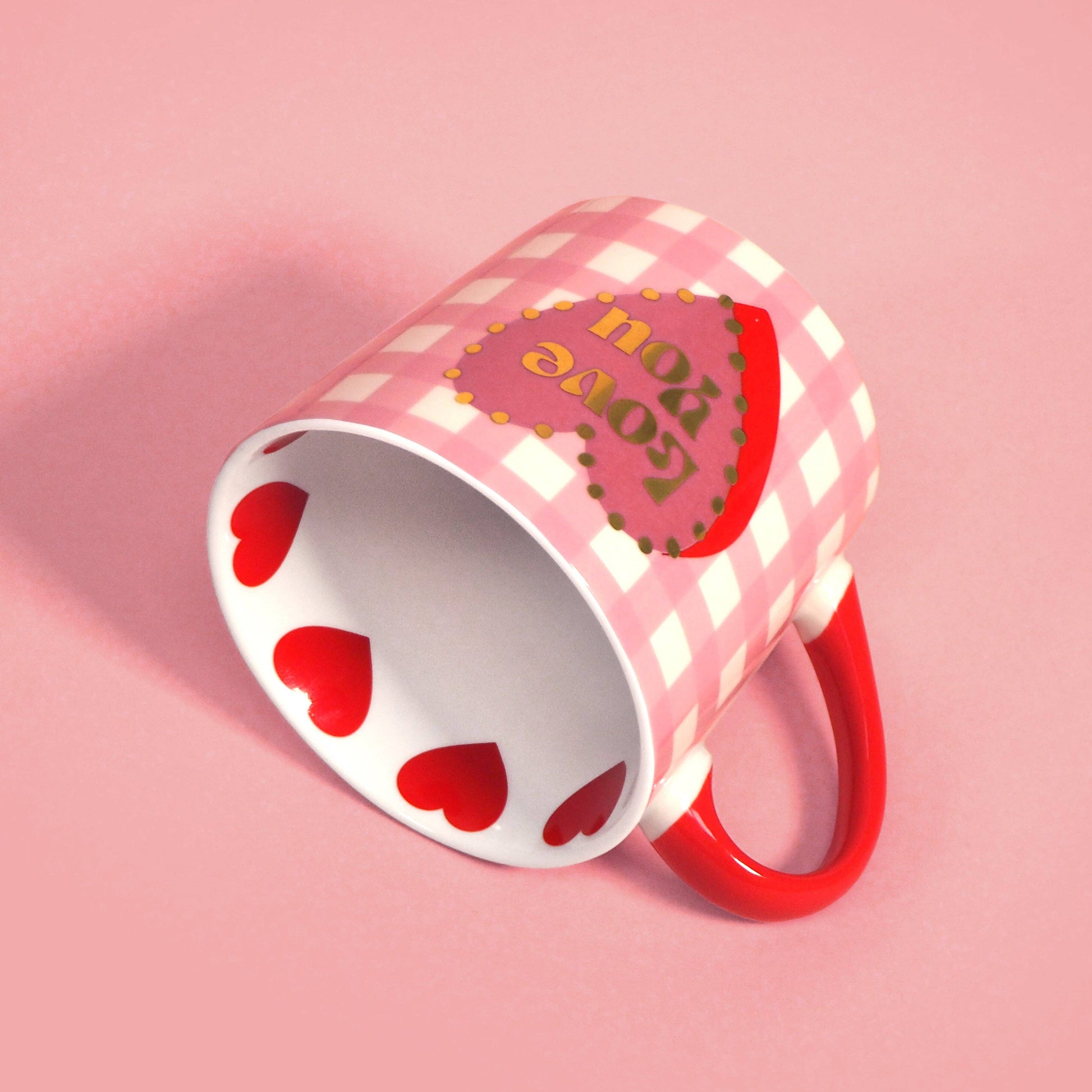 Nuestra taza «Te quiero» es imprescindible para quienes buscan un regalo dulce y especial para un ser querido. Luce un estampado de cuadros vichy rosa pálido sobre fondo blanco y un corazón retro rosa y rojo con la frase «Te quiero» en dorado.