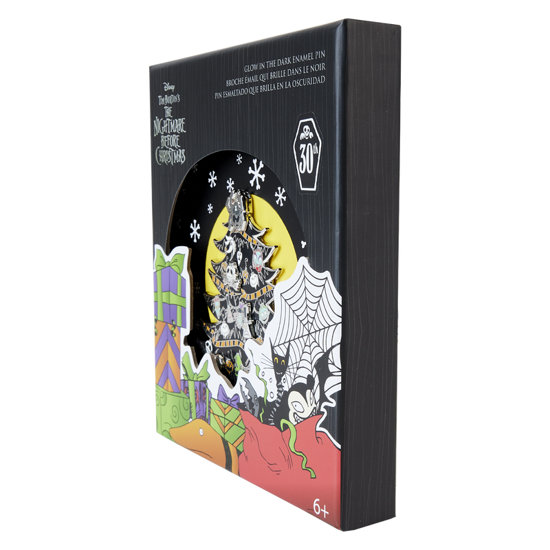 ¡Decora los pasillos con bichos espeluznantes! El pin de árbol de Navidad que brilla en la oscuridad de Pesadilla antes de Navidad de Loungefly trae sustos festivos a tus lugares de vacaciones. Este pin tiene la forma de un árbol y está adornado con una guirnalda de gusanos de arena y luces navideñas con la forma de los ciudadanos de Halloween Town. ¡Mira con atención y verás una araña en lo alto del árbol! Activa detalles espeluznantes que brillan en la oscuridad a medida que se desvanece la luz del día. Un regalo espeluznante en cualquier época del año, este accesorio es justo lo que necesitan los fanáticos de Pesadilla antes de Navidad de Disney Tim Burton.