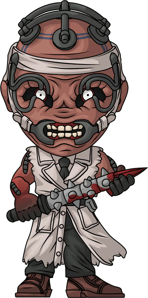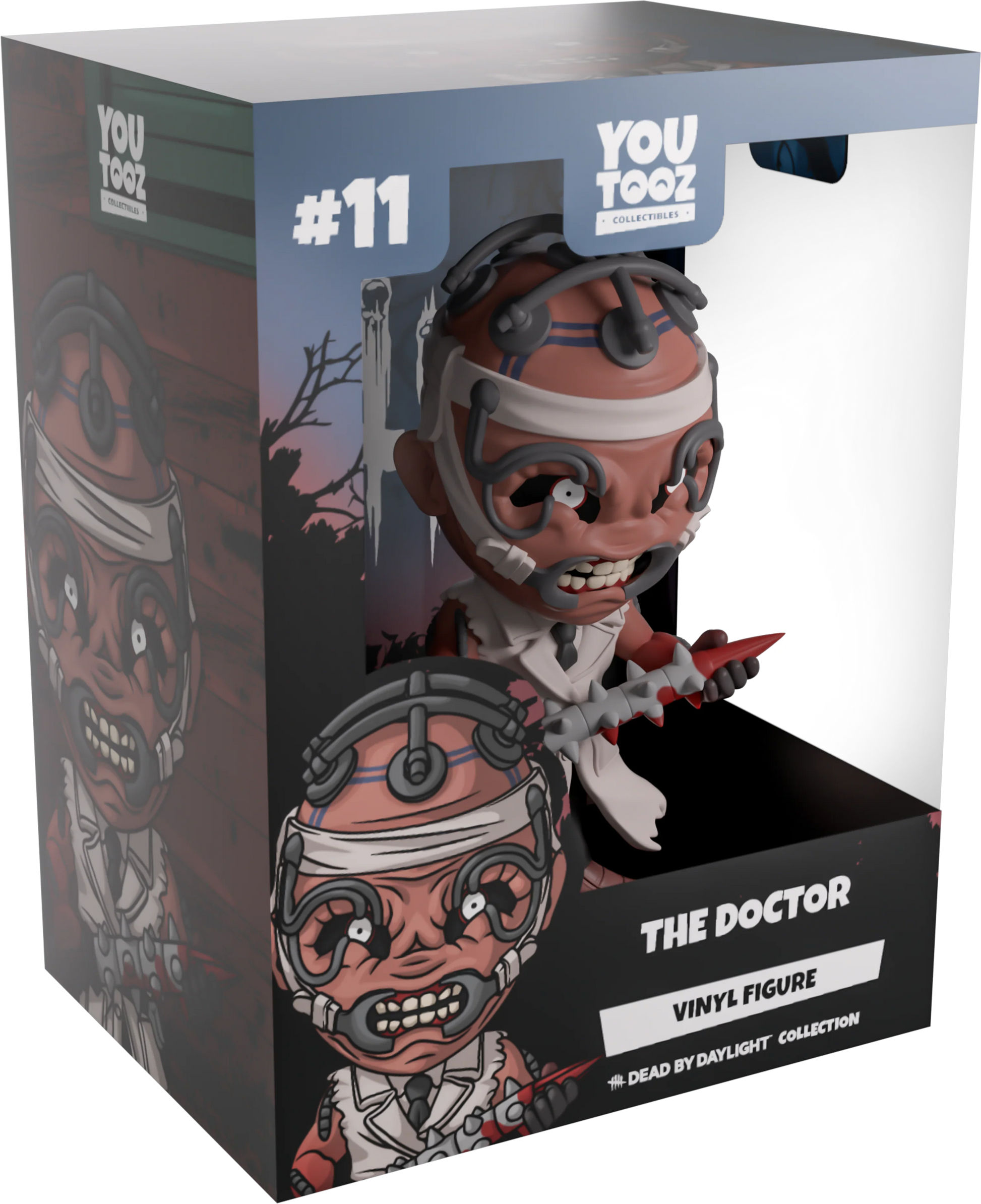 ¿Listo para la cirugía? ¡Bueno, el Doctor está aquí y está listo para cortar incluso si tú no lo estás! De pie, tieso y listo a sus 4,6 pulgadas de alto, el Doctor sostiene su pincho ensangrentado amenazadoramente con ambas manos mientras está vestido con pantalones negros, una chaqueta marrón y una bata blanca larga y andrajosa, rasgada en las mangas y ceñida a la cintura con un cinturón negro. Con su rostro retorcido en un gruñido involuntario, el dispositivo de metal adherido a su cabeza le abre la boca y los ojos. La vitrina fue diseñada para presentar al Doctor detrás de una puerta que se abre para darle la bienvenida a su oficina. Si bien el interior es un bosque de silueta negra con una niebla roja y azul brillante y el logotipo blanco "Dead by Daylight" en la parte posterior, este motivo siniestro continúa en la funda protectora con árboles oscuros que lo rodean por completo mientras su silueta se puede ver a través de la gran ventana transparente en el frente. Este objeto coleccionable viene en una funda exterior protectora mate y en relieve y un protector de plástico de tamaño personalizado para máxima protección durante el envío.