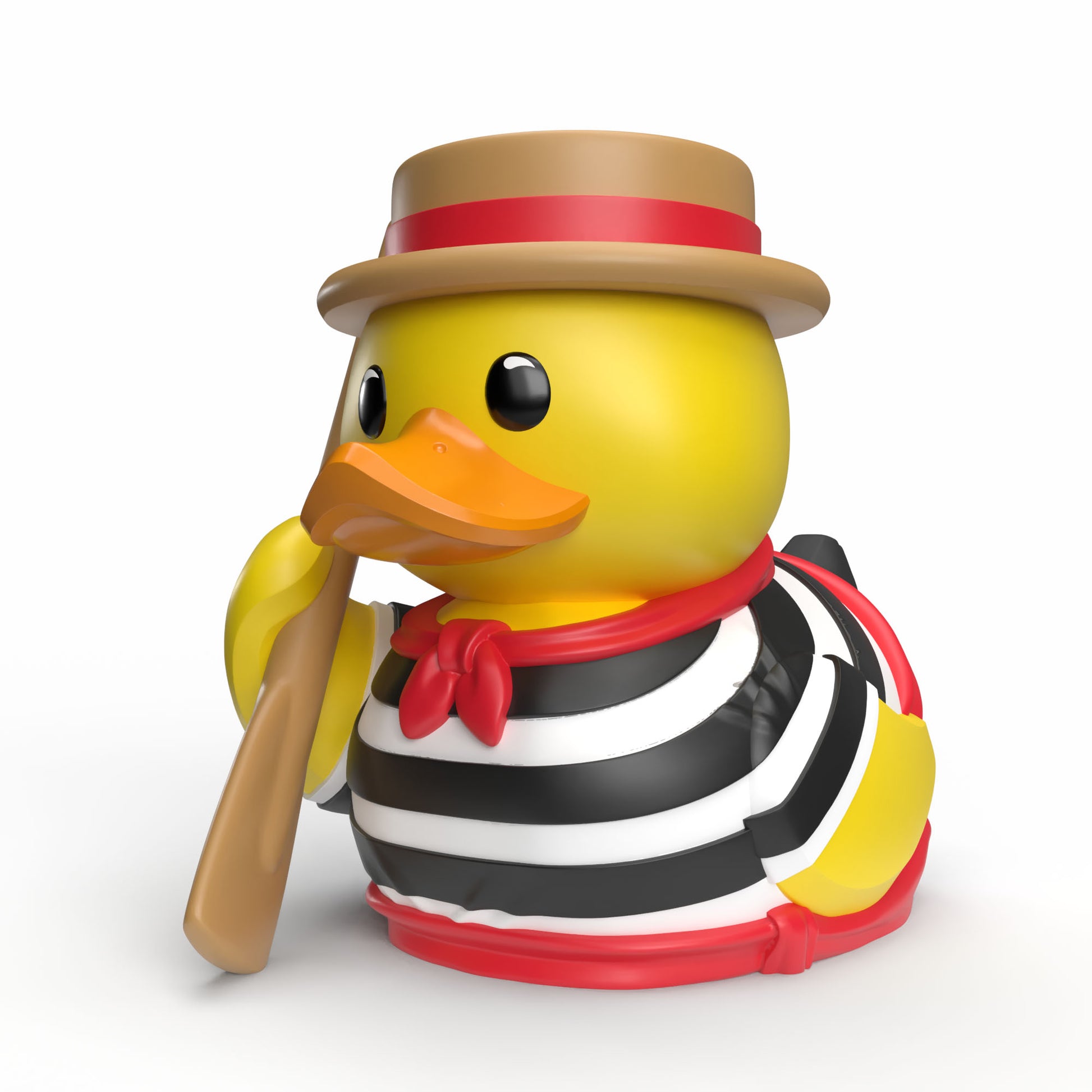 ¡Ciao Bella! Este pato personifica el encanto de Italia con su clásica camisa a rayas, su sombrero tradicional y su remo en mano, listo para unirse a tu colección de juguetes con una elegancia natural. Un imprescindible para los amantes del estilo europeo atemporal y las escapadas con estilo.