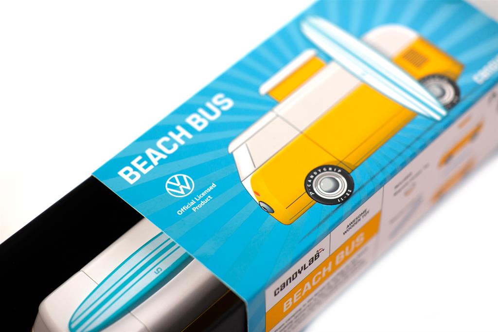 ¡La furgoneta playera ha vuelto! Ahora con licencia oficial de VW: fíjate en el brillante emblema del frontal. Esta icónica Volkswagen Tipo 2 viene con techo magnético para acampar y una tabla de surf.