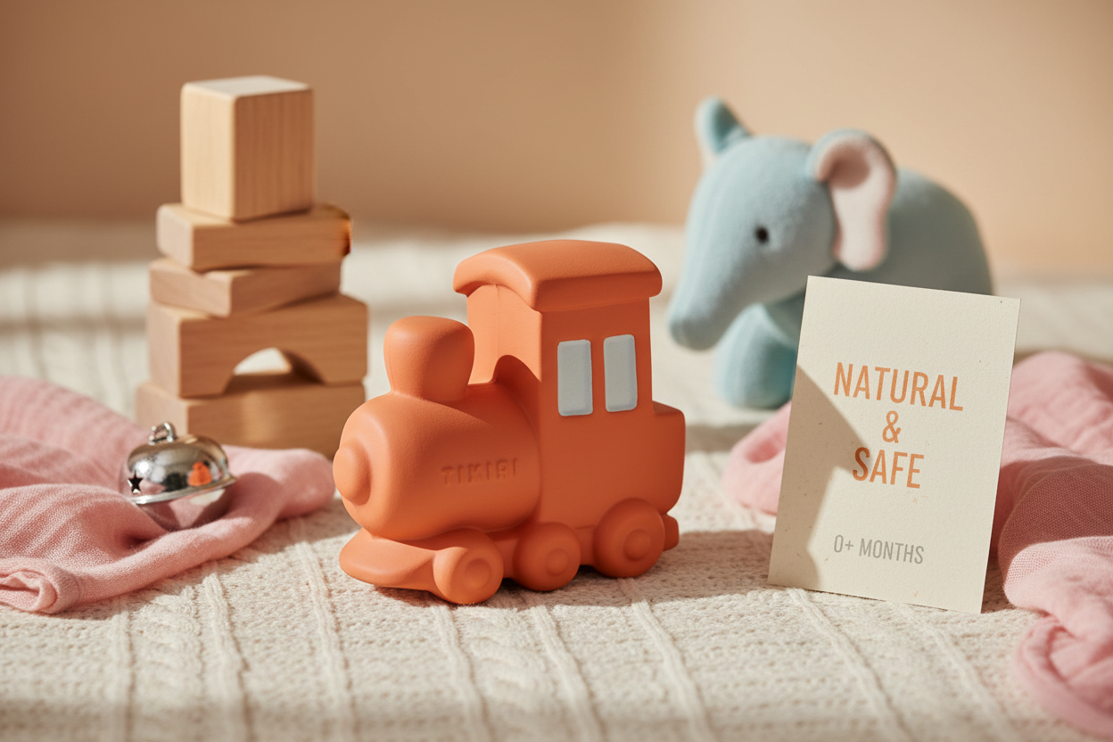 Tikiri: VROOM VROOM FRIENDS / TRAIN 8,13x4,32x7,62cm, con cascabel, caucho natural, con tarjeta, 0+