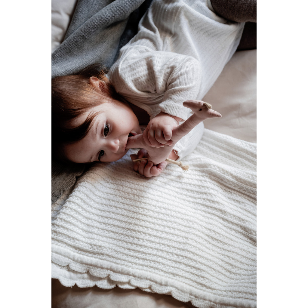 De giraffenrammelaar uit de collectie "Exotische Dieren", met zijn lange nek, is ideaal voor de eerste grijppogingen van kinderen. Dankzij het GOTS-gecertificeerde hypoallergene katoen is het speeltje veilig om in de mond te stoppen en kan het zelfs in de wasmachine gewassen worden op een fijnwasprogramma. Bovendien past het eenvoudige maar elegante ontwerp naadloos in elke kamer en kan het, naast de kinderkamer, ook in andere ruimtes in huis een mooie decoratie vormen.