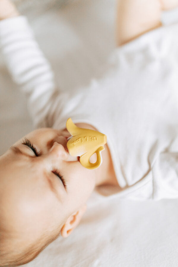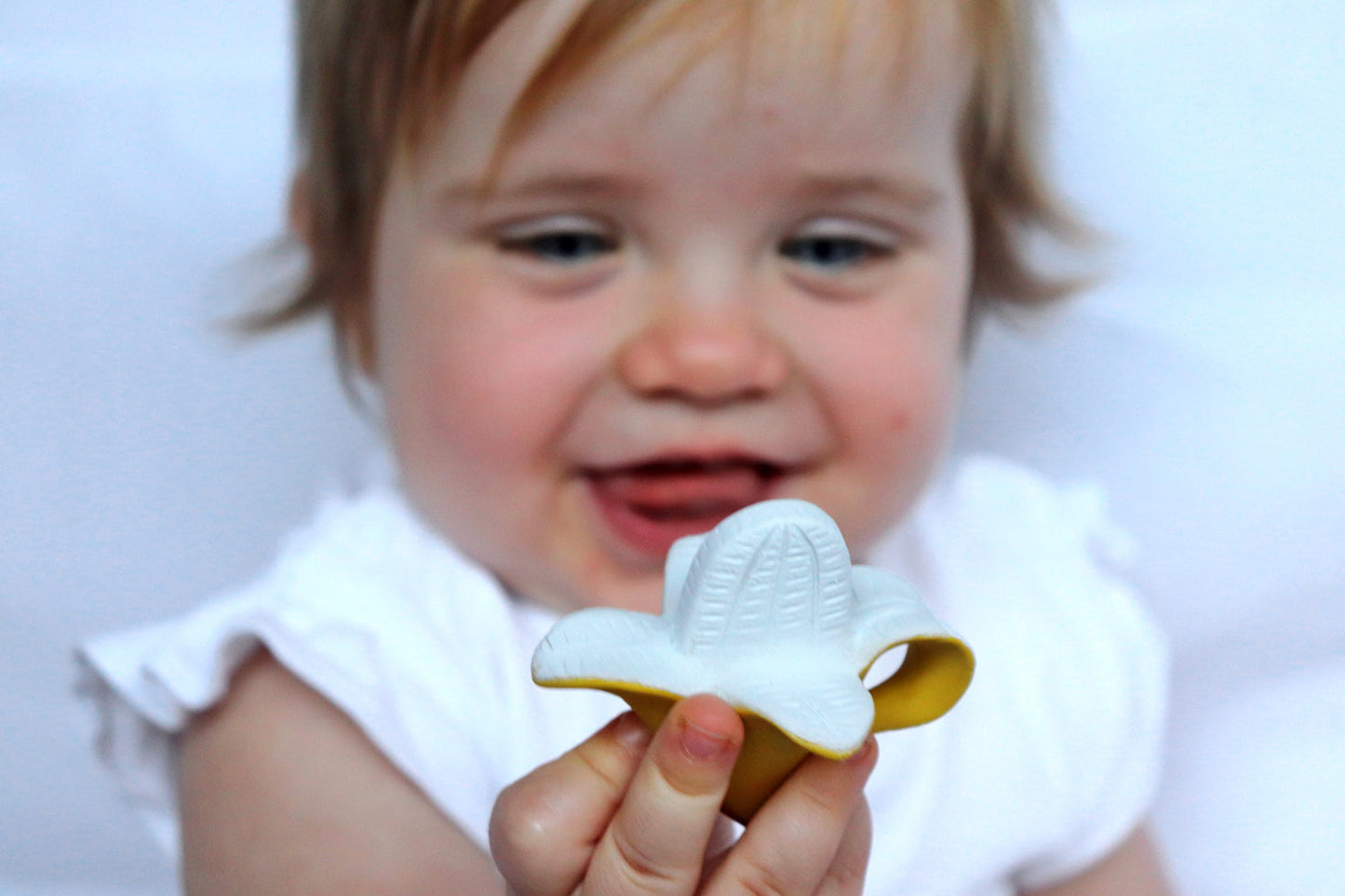 Anita the Bananita est le nouveau concept de jouet de dentition pour les bébés d'Oli&Carol. Cette conception légère et ergonomique est parfaite pour qu'ils puissent la tenir et la mâcher facilement. Ce jouet de dentition pour bébé comprend une gamme de textures pour aider à apaiser les gencives des petits et est facile à accrocher à un porte-sucette et à emporter partout avec vous !