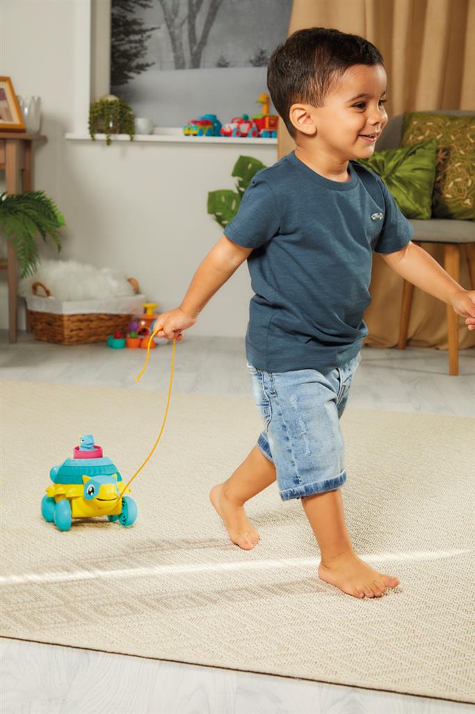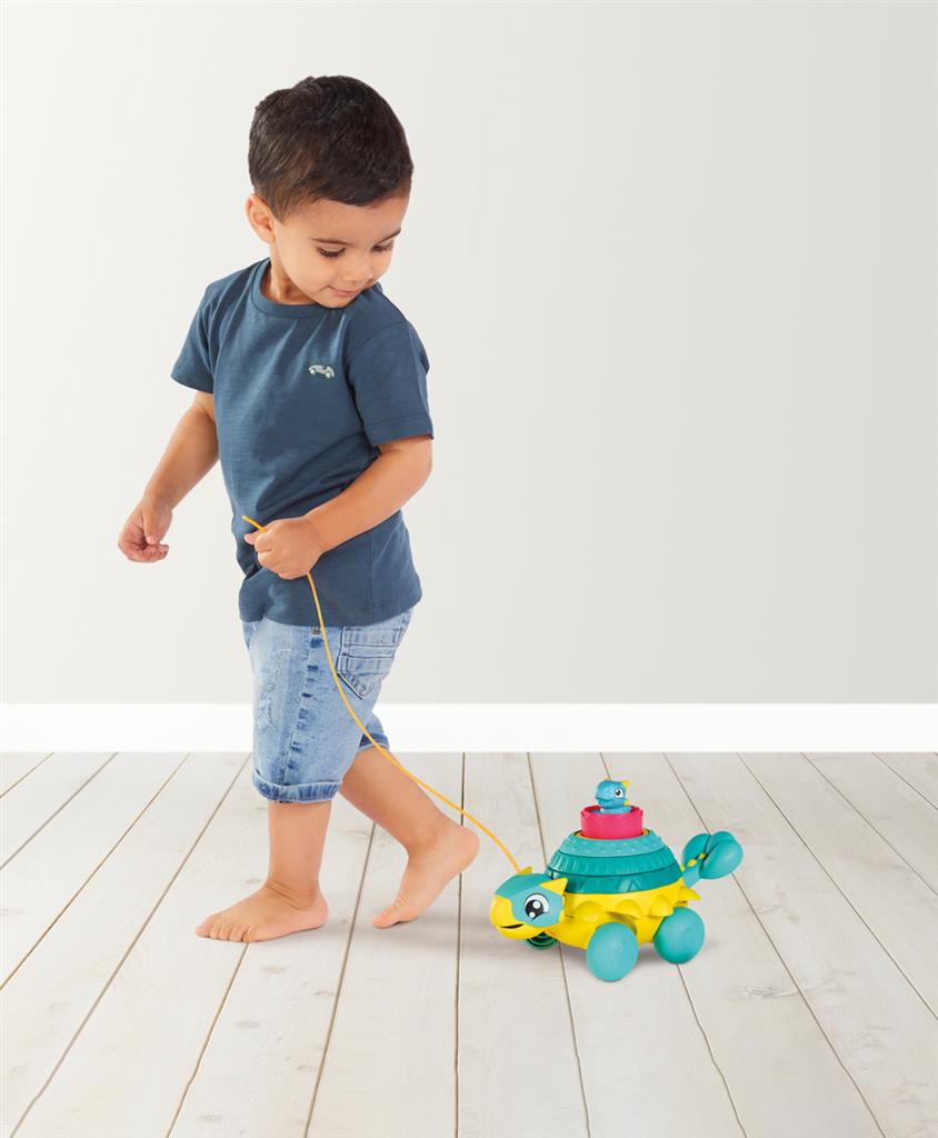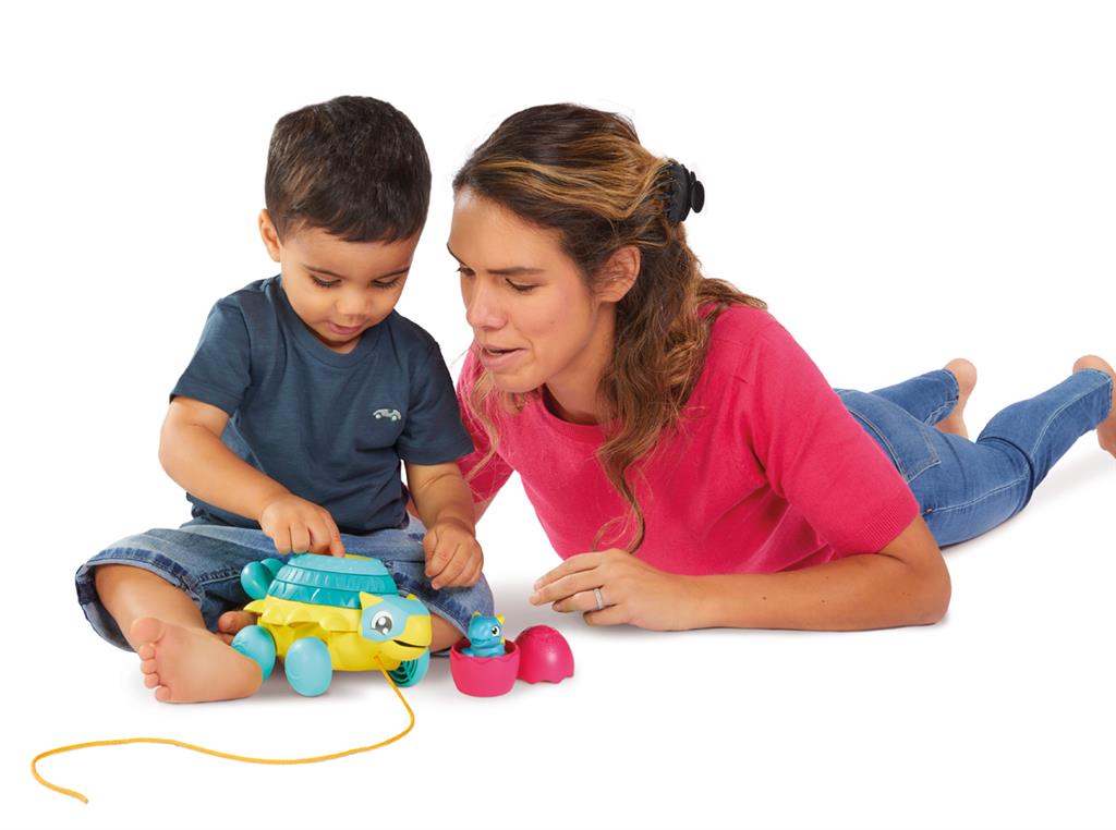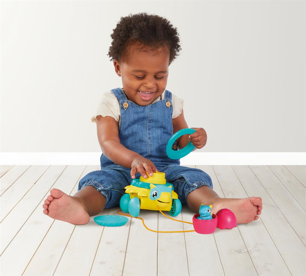 Promène cet adorable dinosaure avec son bébé dino sur le dos. Tire la maman ankylosaure à l’aide du cordon et regarde-la se déplacer avec sa démarche oscillante. Empile ses 4 anneaux sur son dos pour en faire une carapace et secoue le bébé dinosaure pour l’entendre grogner.