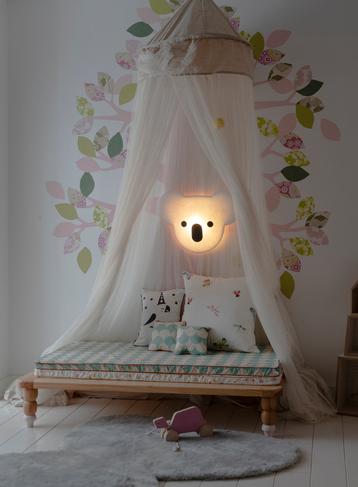 Une Applique ‘Masque Animal’ pour mettre dans une chambre d’enfant. LED max 8W, ampoule GX53 incluse, CE testé. Le matériel est fait à base de bouteilles en plastique recyclés.