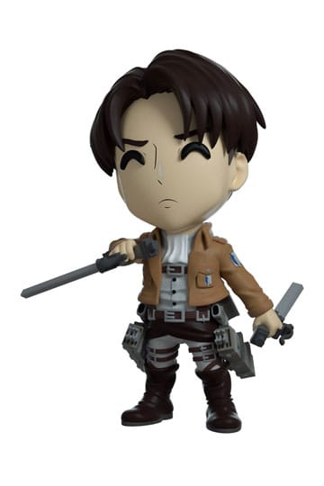 Si vous ne voulez pas mourir, réfléchissez. Quand il s'agit d'enseigner la discipline à quelqu'un… Je crois que la douleur est le moyen le plus efficace. Aucune victime; n'ose pas mourir. On dit qu'il est le soldat le plus fort de l'humanité, le capitaine de l'escouade d'opérations spéciales, Levi Ackerman mesure 4,6 pouces et porte l'uniforme standard du Scout Regiment. Levi porte une veste marron sur une chemise boutonnée blanche, ainsi qu'une lavallière blanche. Son pantalon est blanc et est rentré dans ses bottes noires à hauteur du genou. Levi arbore une coiffure en contre-dépouille. La pochette de Levi est magnifiquement illustrée pour montrer le feu et un Titan colossal. Sa boîte-fenêtre à double paroi comprend des dessins de Levi, face à face avec un Titan. L'intérieur de son emballage montre des débris de feu et le logo Attack on Titan.