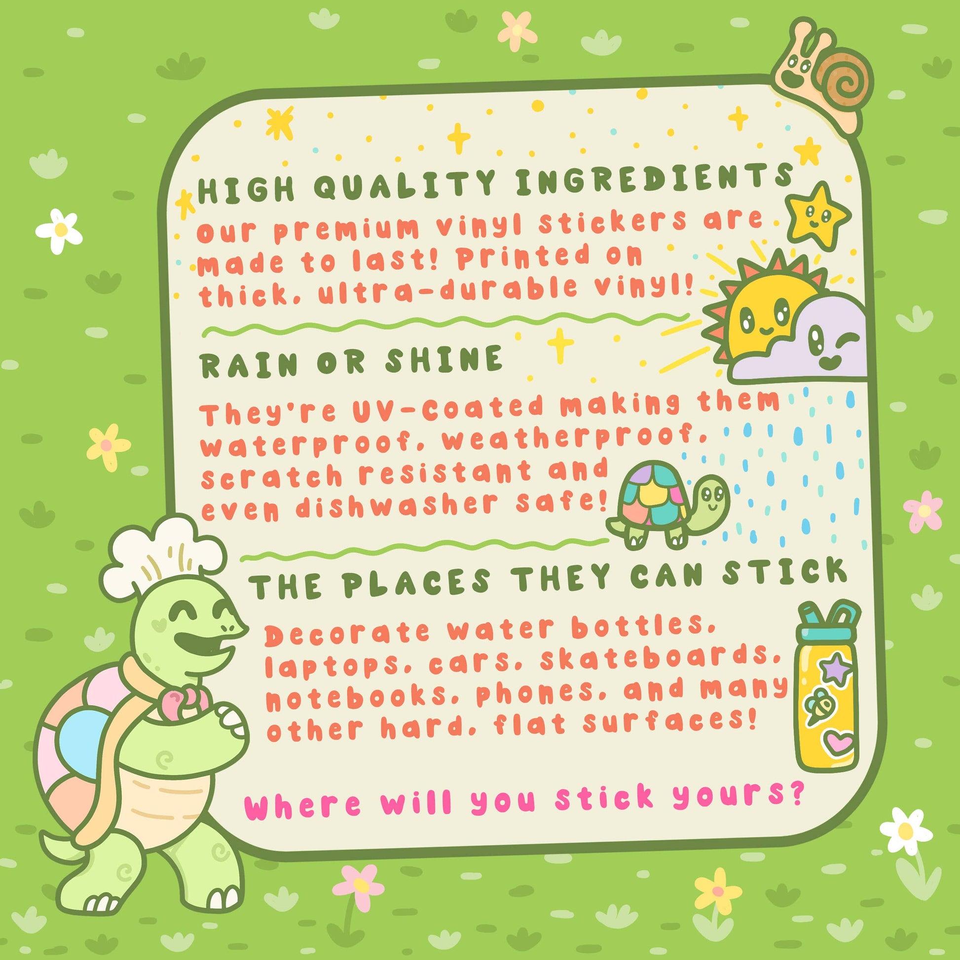🐢 Nos autocollants vinyle « Turtley Awesome » sont fabriqués à partir d'ingrédients de la plus haute qualité du marché ! Imprimés sur un vinyle épais et ultra-résistant, ces autocollants sont conçus pour durer. Leur revêtement anti-UV les rend imperméables, résistants aux intempéries et compatibles lave-vaisselle !