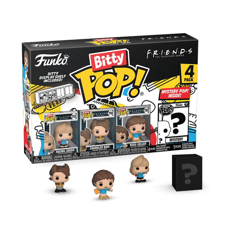 Vos Pops Friends™ préférées ! ont été réduits en Bitty Pops ! Agrandissez votre collection avec cet assortiment de Bitty Pop ! figurines représentant vos personnages de sitcom les plus appréciés sous forme de figurines miniaturisées ! Ce pack de 4 comprend Bitty Pop ! Rachel Green™ (cheveux des années 80), Bitty Pop ! Chandler Bing™ (cheveux des années 80), Bitty Pop ! Ross Geller™ (80's Hair) et un mystère Bitty Pop ! chiffre. Le possible mystère Bitty Pops ! sont Hyper Rare (1/6) Joey Tribbiani™ (Cowboy), Hyper Rare (1/6) Phoebe Buffay™ (Clip musical), Rare (1/3) Phoebe Buffay™ (Costume d'Halloween) et Rare (1/3) ) Joey Tribbiani™ (dans les vêtements de Chandler).