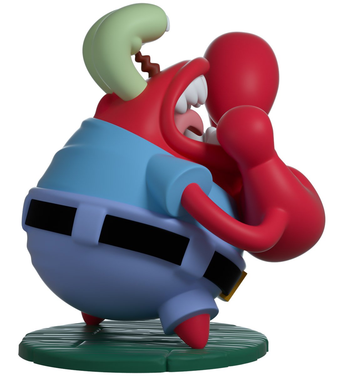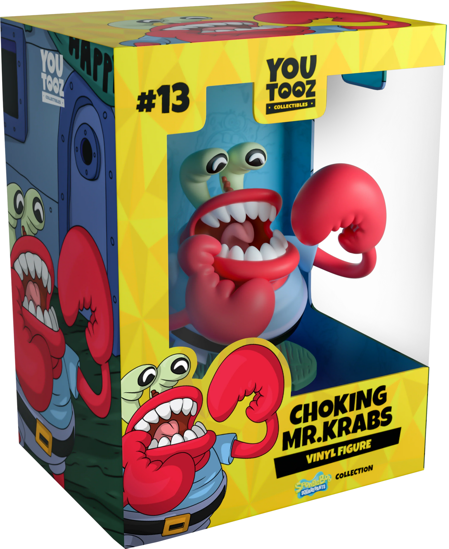 ECCHT ! ACCHH ! GHRGH ! M. Krabs sort d'une course aux pommes pour s'en coincer une ! À 3,6 pouces de hauteur, il pose avec son corps rond de crustacé recroquevillé et sa bouche ouverte pour révéler de grandes dents et une langue recourbée alors qu'il s'étouffe douloureusement. Il lève une grosse griffe rouge et fait signe vers sa bouche, tandis que ses longs yeux se plissent douloureusement alors qu'il tente de dégager sa trachée. Tout en étant vêtu d'une tenue décontractée parfaite avec son t-shirt simple bien glissé dans son pantalon bleu. L'extérieur de son emballage le montre s'étouffant violemment dans le hall du Krusty Krab. Alors que l'intérieur est un dégradé bleu océan collé avec des illustrations de Bob l'éponge. La pochette de protection est imprimée du motif triangulaire jaune vif de Bob l'éponge. Cet objet de collection est livré dans un manchon extérieur mat, gaufré et protecteur et un protecteur en plastique de taille personnalisée pour une protection maximale pendant l'expédition.
