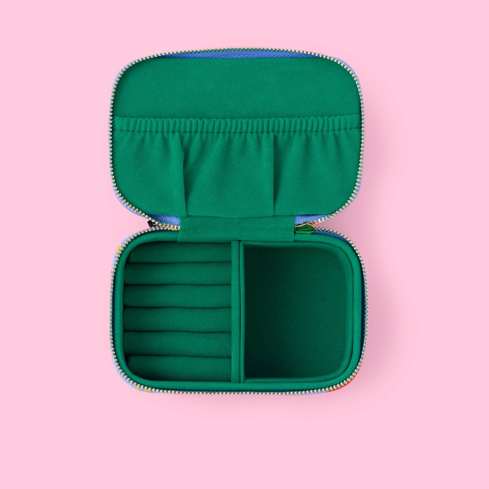 * La partie inférieure est divisée en deux compartiments : un ouvert, un avec cinq emplacements rembourrés pour bagues