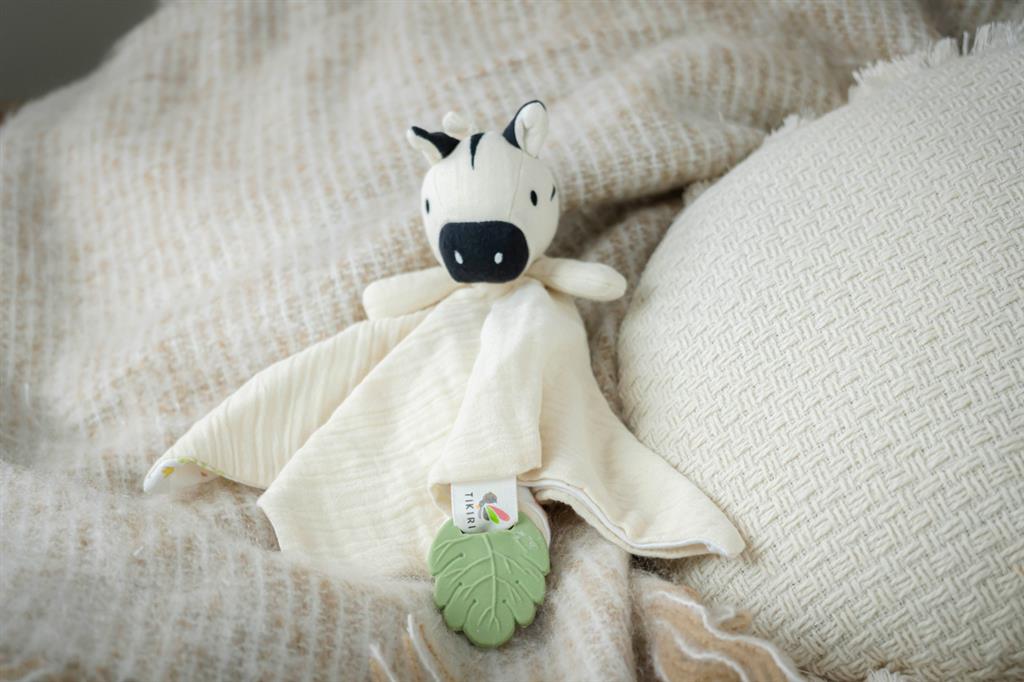 Doudou zèbre en mousseline vert sauge avec anneau de dentition en caoutchouc naturel.