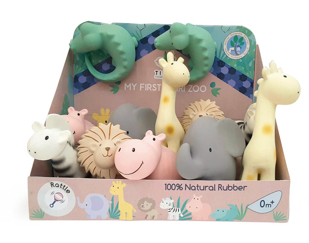 Jouets de bain en caoutchouc naturel et anneaux de dentition.