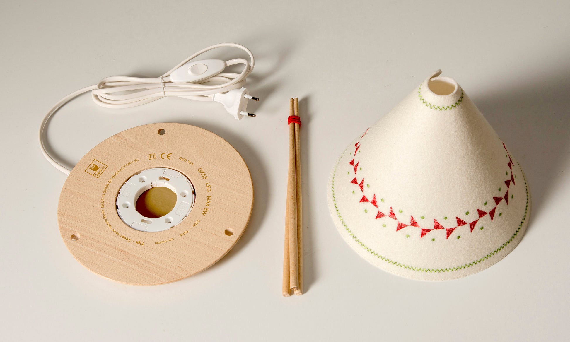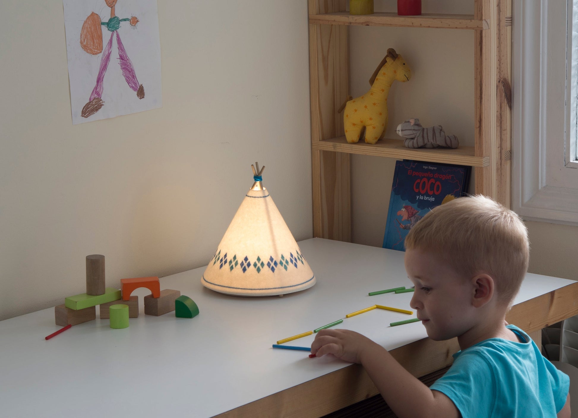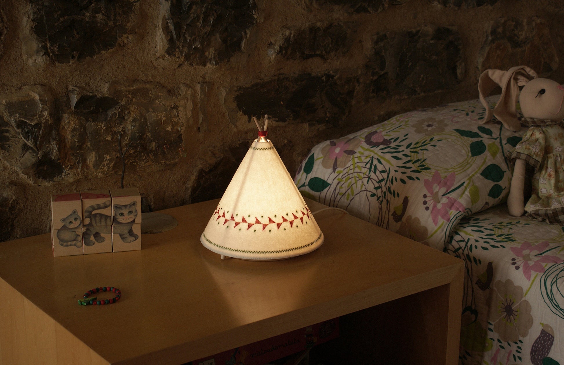 Une lampe de table en forme de Tipi. Led 8W max, ampoule GX.35 incluse, CE testé.