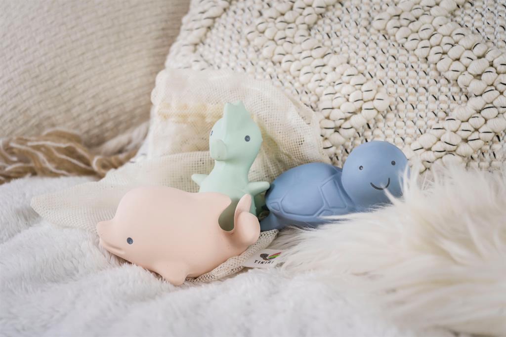 Jouets de bain en caoutchouc naturel et anneaux de dentition.