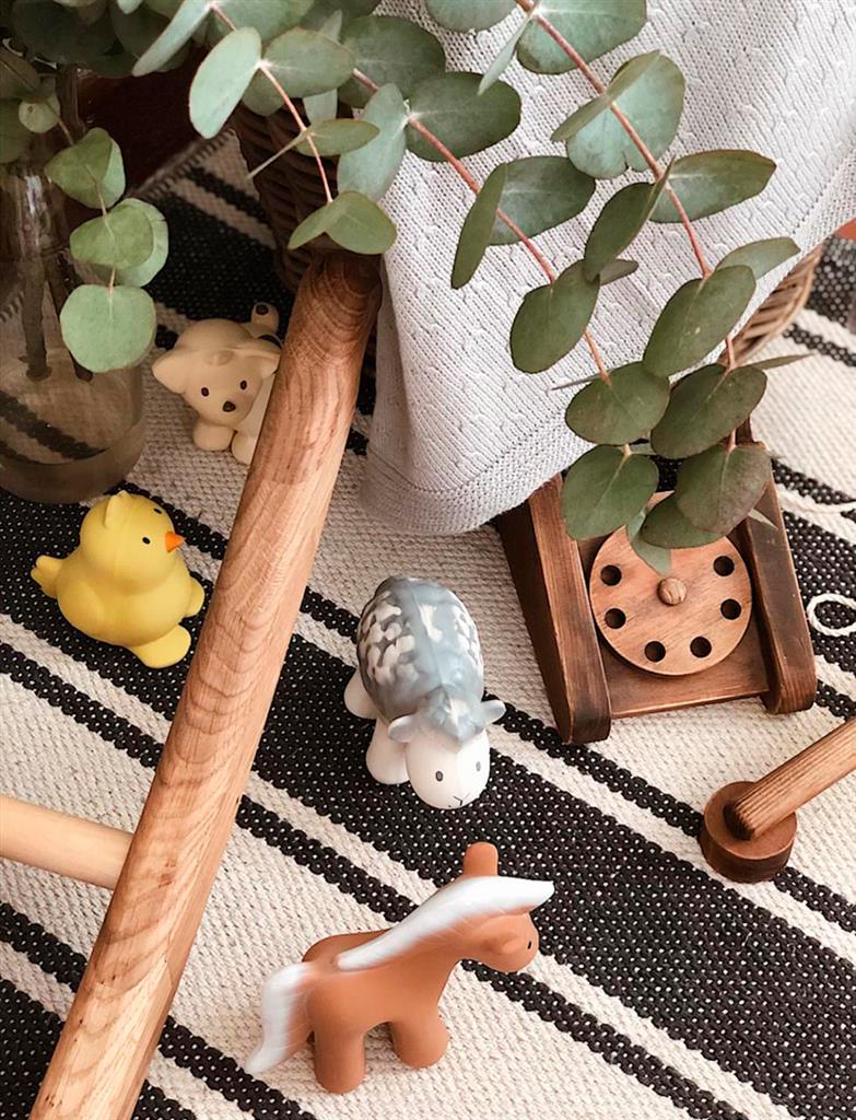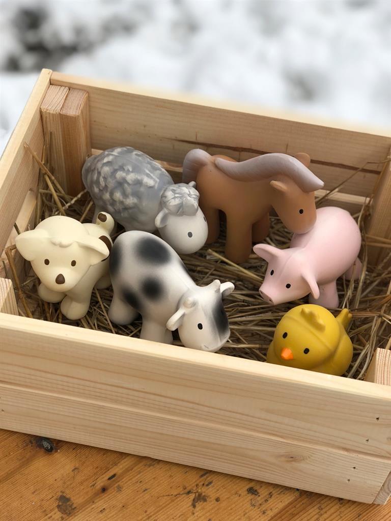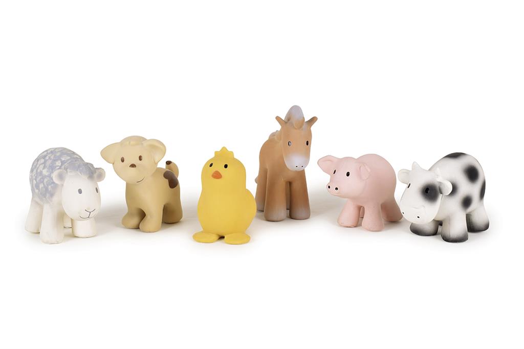 6 Jouets de bain en caoutchouc naturel et anneaux de dentition.