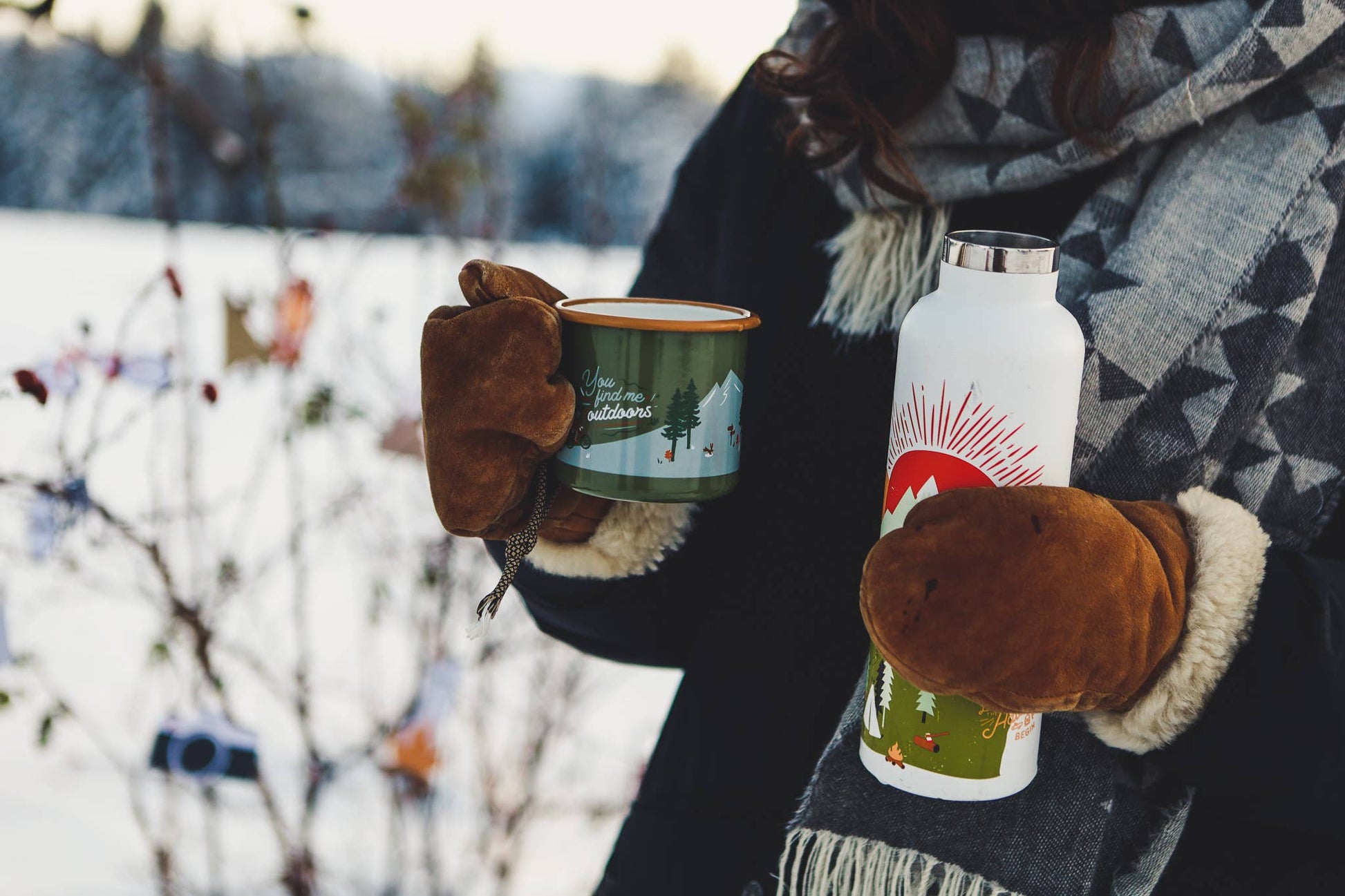 La tasse en émail “You Find Me Outdoors” de Roadtyping est pensée pour les amoureux de la nature, du camping et des grands espaces. Son design vert forêt orné de paysages de montagne, de cyclistes et de randonneurs évoque la liberté et l’aventure.