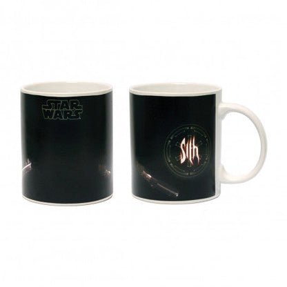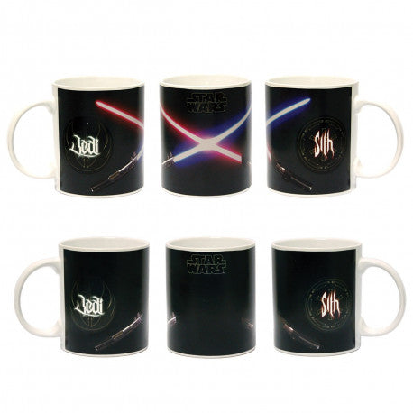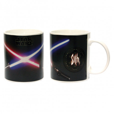 Ce mug Star Wars affiche un duel de sabres laser (qui s'illuminent avec la chaleur) entre Jedi et Sith.
