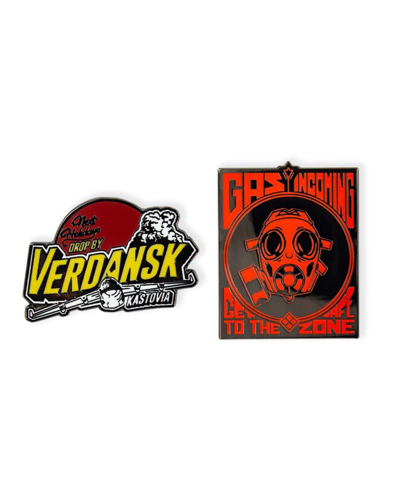 - Deux pins en métal émaillé dur de qualité supérieure avec une finition brillante avec l'emblème Call of Duty: Warzone et l'emblème Verdansk and Road Tripsur une carte de support.