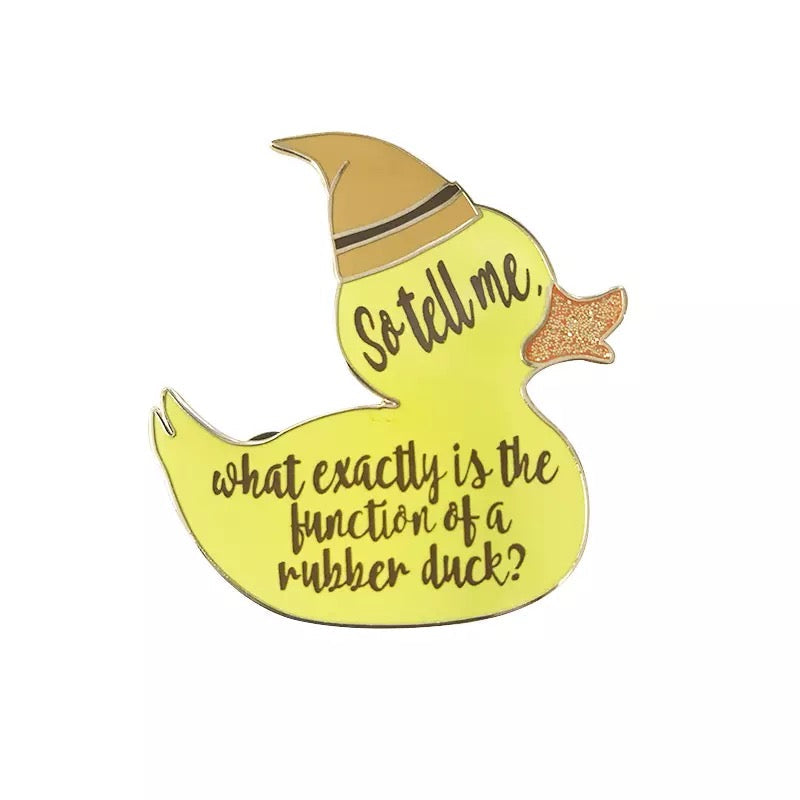 Pin's canard jaune avec un chapeau de sorcier et la phrase culte du film Harry Potter "So tell me, what exactly is the function of a rubber duck?"