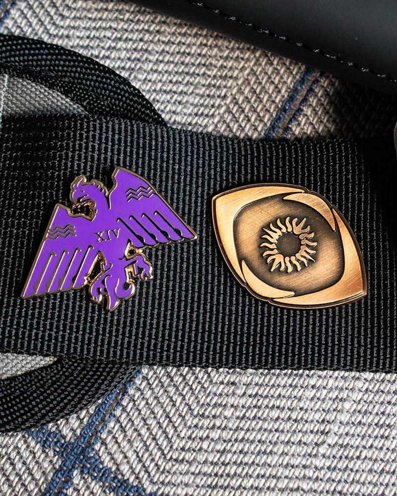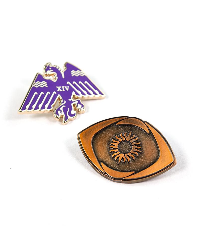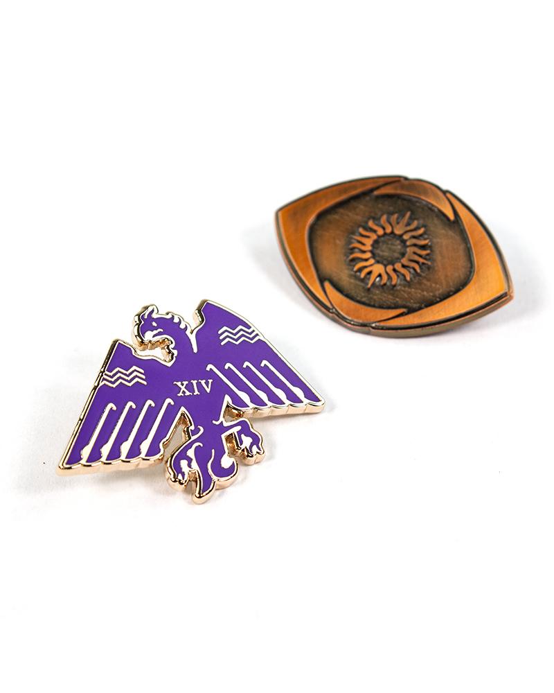 - Deux broches en métal émaillé dur de qualité supérieure avec une finition brillante avec le Tricorn et le Guardien sur une carte de support