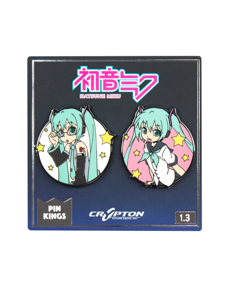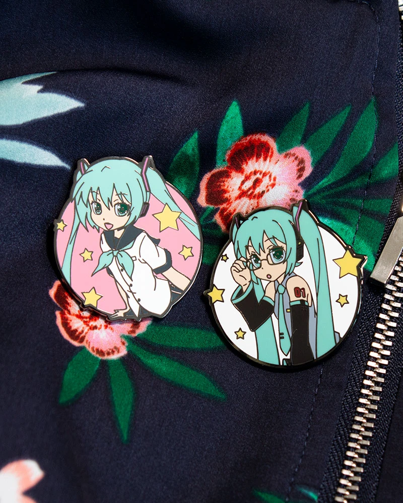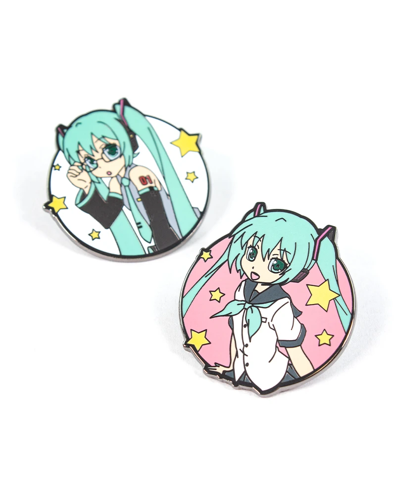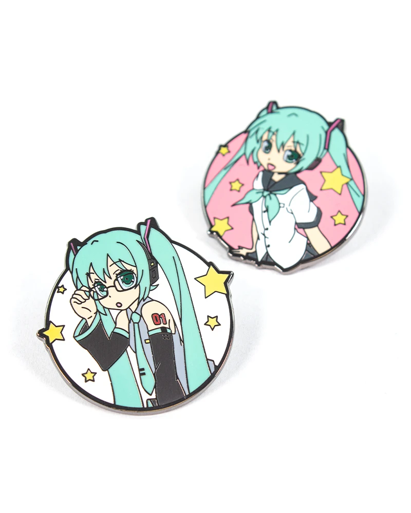 - Deux épingles en métal émaillé dur de qualité supérieure avec une finition brillante avec des motifs Hatsune Miku sur une carte de support.