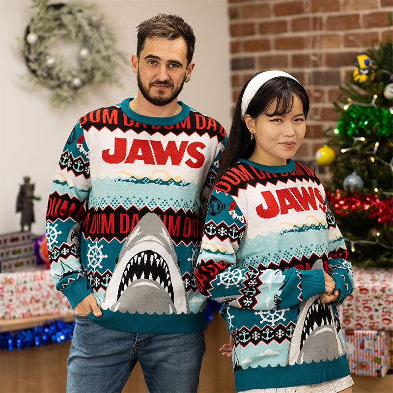 Da dum… da dum… qu'est-ce qui se profile là-bas? C'est le Père Noël qui descend par la cheminée ? Ou est-ce un requin tueur à la recherche de sa prochaine proie ? Nous préférerions avoir le premier choix, mais ce ne sera peut-être pas le cas cette fois-ci. Ce pull de Noël haut de gamme 100% tricoté présente l'illustration emblématique de l'affiche du film Jaws aux côtés de petites décorations festives supplémentaires parsemées partout.