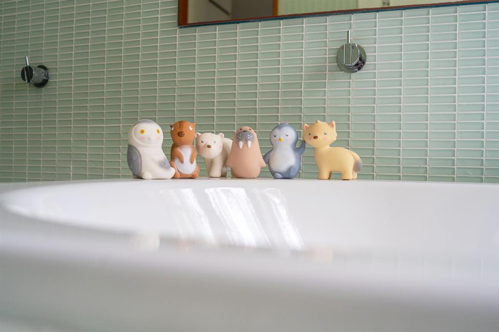 Jouets de bain en caoutchouc naturel et anneaux de dentition.