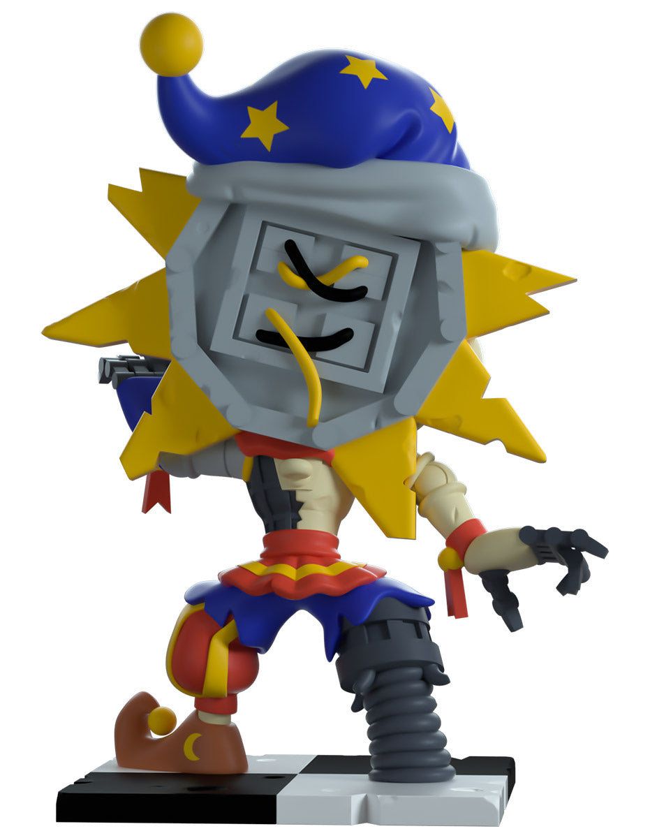 Mesurant 4,9 pouces de hauteur avec un sourire menaçant s'étendant sur leur visage qui a été arraché pour révéler un endosquelette métallique inquiétant, des rayons de soleil irréguliers émergent des côtés de la tête ronde d'Eclipse qui est surmontée d'un chapeau de nuit à motifs d'étoiles bleues et jaunes. Tendant une main bleue vers vous alors que leur main droite courbe ses doigts, l'épaisse bobine d'une jambe en métal est fermement plantée sur le sol à côté d'une chaussure marron bouclée. L'extérieur de leur emballage met littéralement en lumière Eclipse alors qu'ils se trouvent au centre d'un entrepôt en désordre tandis que l'intérieur est imprimé avec le logo néon « Frèche de sécurité » et recouvert d'un motif à carreaux bleu et noir qui se fraye un chemin sur la pochette de protection. car leur silhouette peut être vue à travers la grande fenêtre d'affichage transparente située à l'avant. Cet objet de collection est livré dans une pochette extérieure de protection mate en relief et dans un protecteur en plastique de taille personnalisée pour une protection maximale pendant l'expédition.