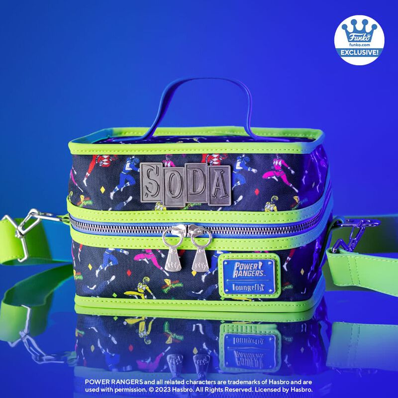 La glacière présente un motif des Power Rangers sautant au combat. Cette glacière a une doublure isolée, une bandoulière amovible, du matériel de couleur argent brillant, des tirettes de fermeture éclair à languette soda, un logo Funko imprimé haute densité pour la doublure et est faite de nylon.