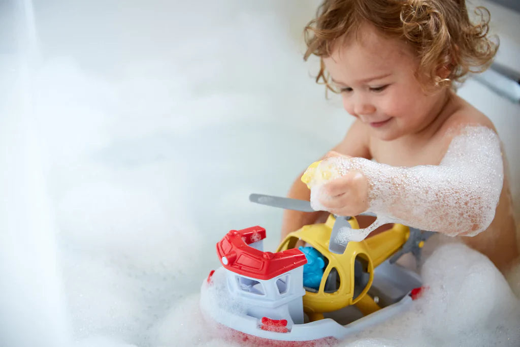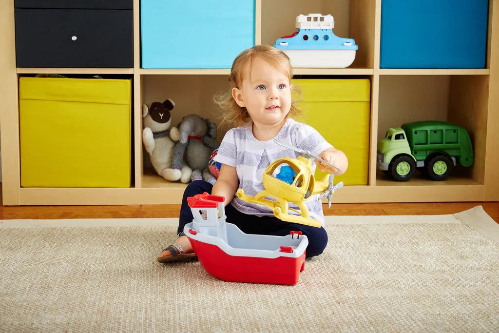 Aucun sauvetage aquatique n'est hors de portée lorsque le bateau et l'hélicoptère de sauvetage Green Toys™ reçoivent l'appel ! Ce jouet deux-en-un est tout aussi amusant sur terre que dans l'eau, avec un hélicoptère grandeur nature jaune vif niché sur le pont arrière du bateau de sauvetage rouge et blanc. L'ensemble comprend également deux personnages – un Capitaine Canard et un Pilote Ours – prêts à aller là où l'imagination de votre enfant les mène. Spécialement conçu pour flotter dans l’eau et ouvert pour le lave-vaisselle, ce navire est un complément parfait à toute flotte de baignoires.