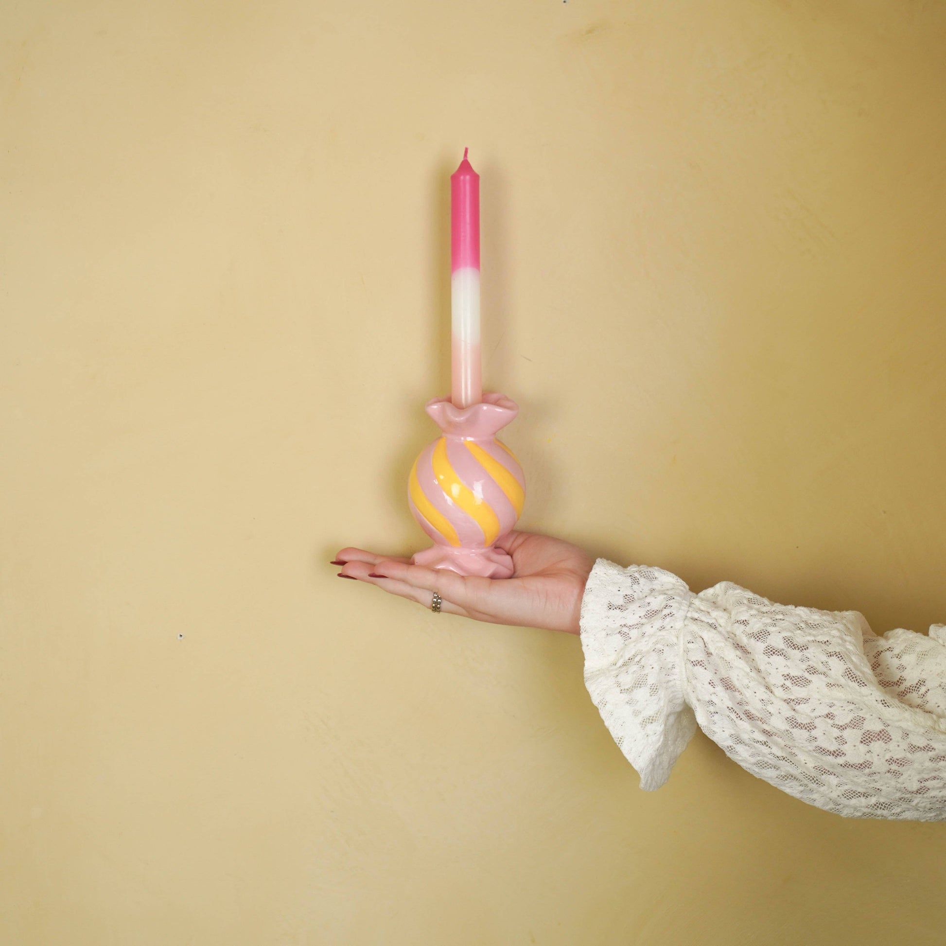 Conseil de style : Associez le bougeoir rond en forme de bonbon à d'autres accessoires inspirés des bonbons pour un look ludique.