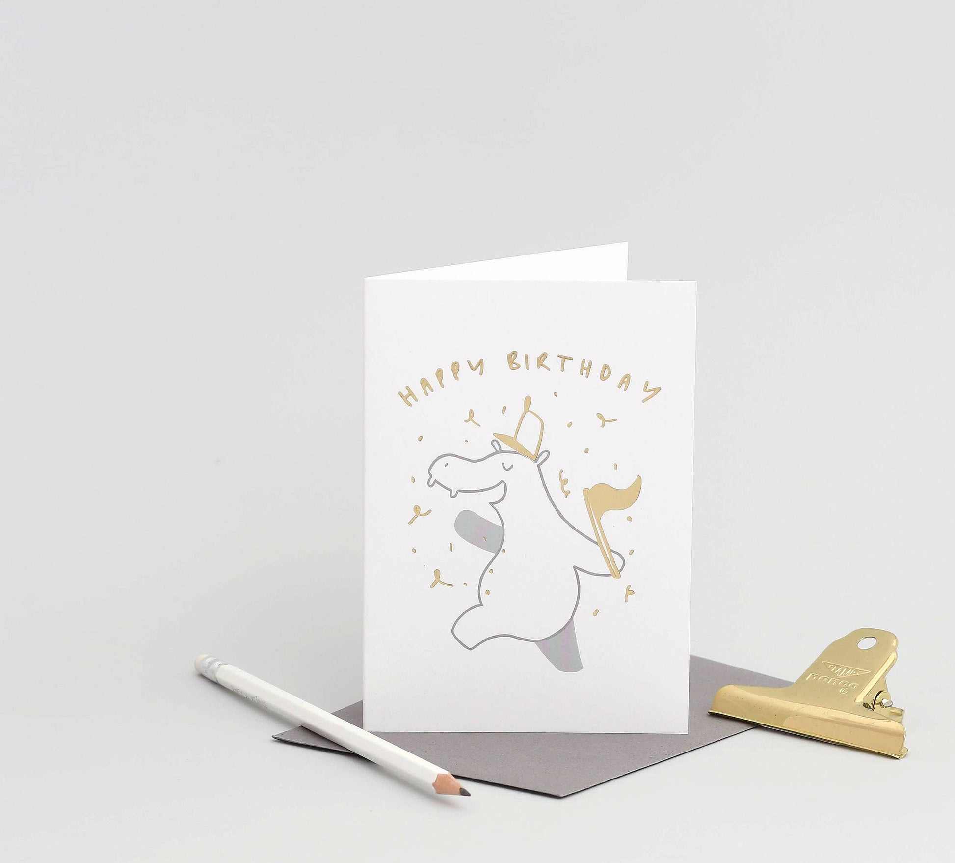 Une carte de vœux d'anniversaire pour enfant simple, audacieuse et amusante, écrite à la main, avec une illustration amusante d'hippopotame en fanfare.