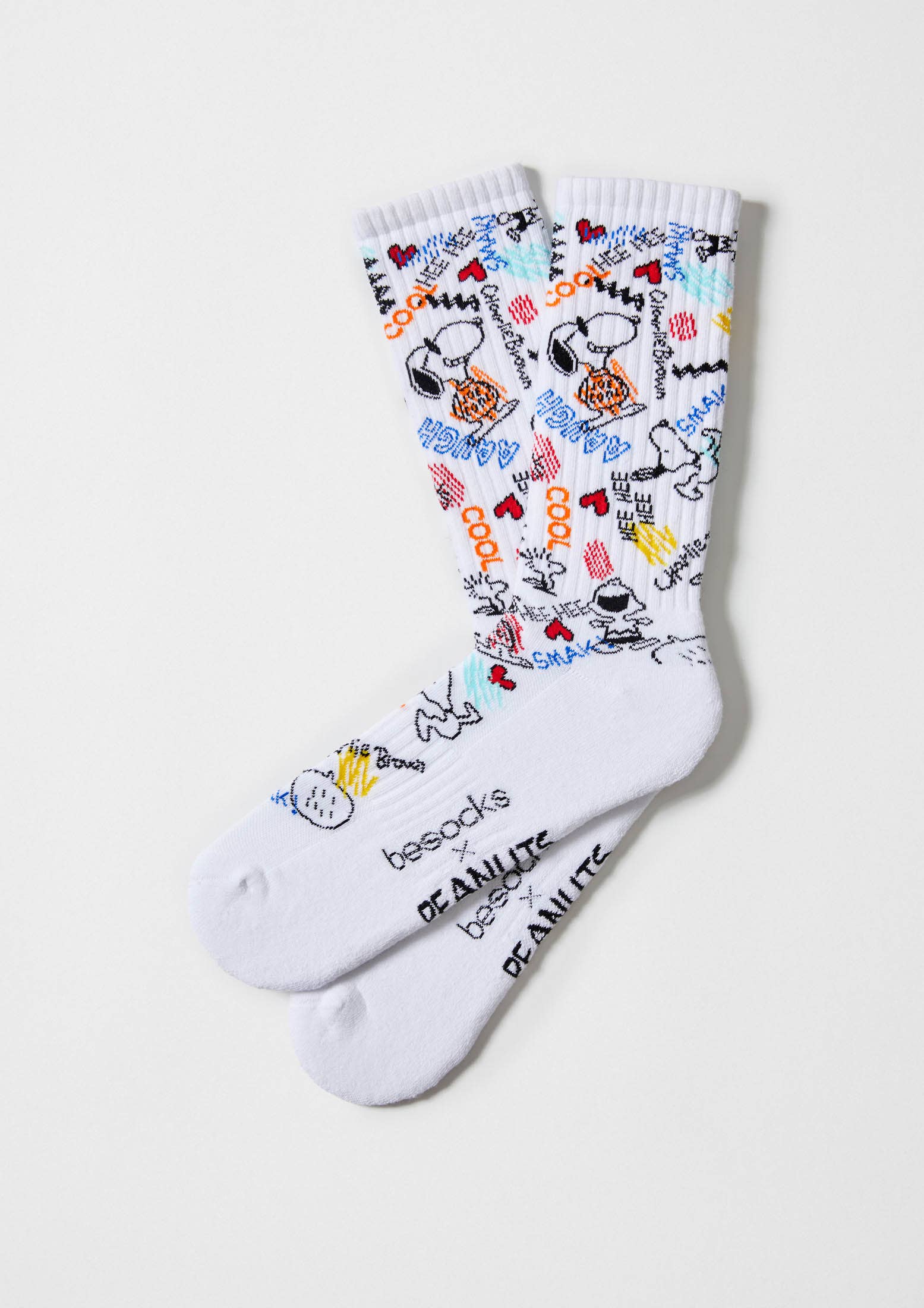 Chaussettes PEANUTS blanches de style sportif fabriquées en coton 100% biologique. Hauteur mi-mollet. Idéal pour les tenues de style streetwear. CERTIFIÉ GOTS / EMBALLAGE FSC